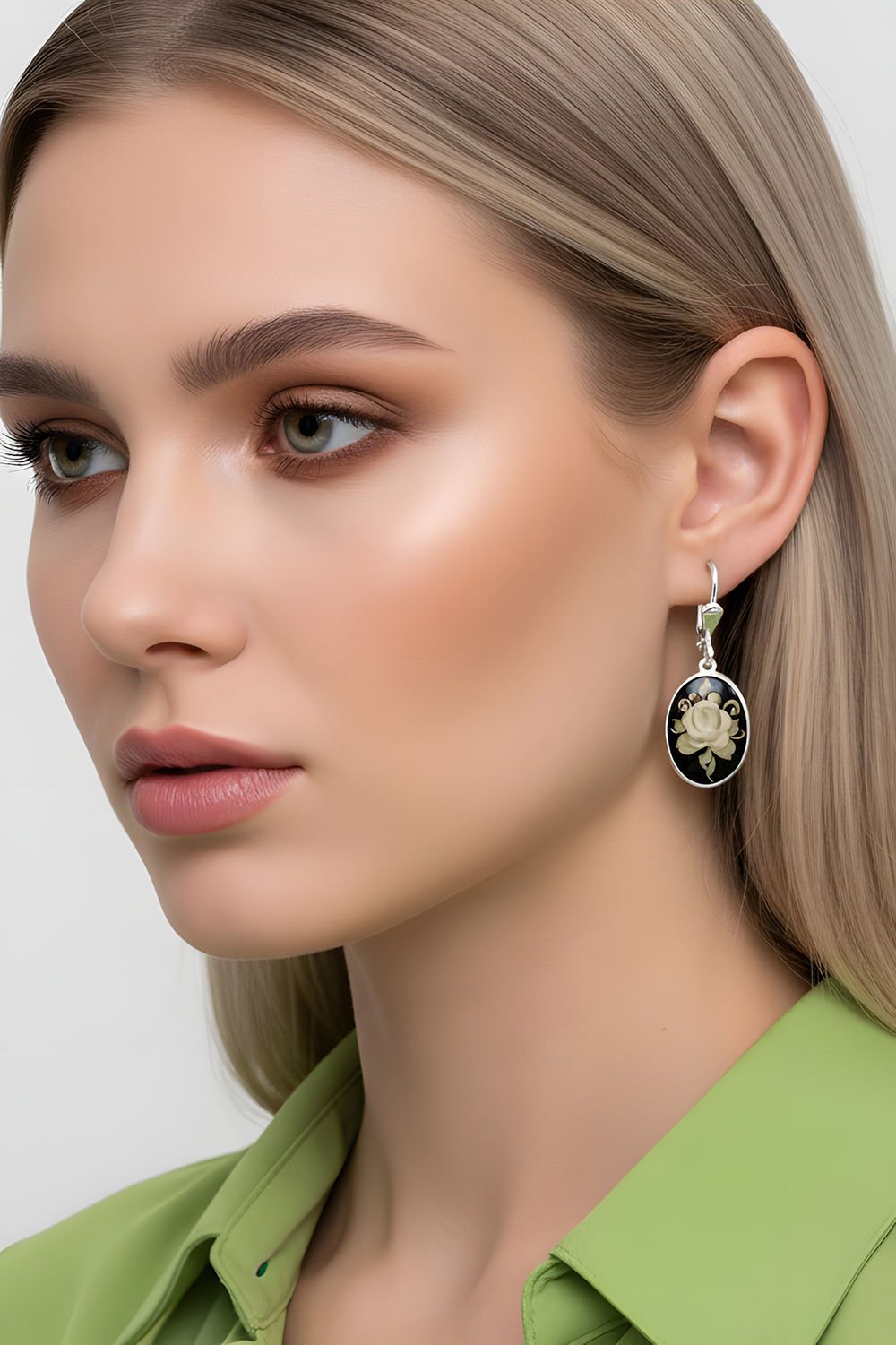 Damla Kehribar İçine Gül Oyma El İşi Gümüş Küpe |