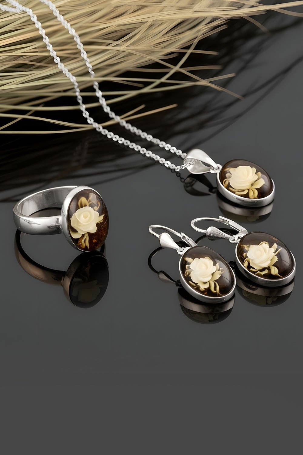 Damla Kehribar İçine Gül Oyma El İşi Gümüş Üçlü Set