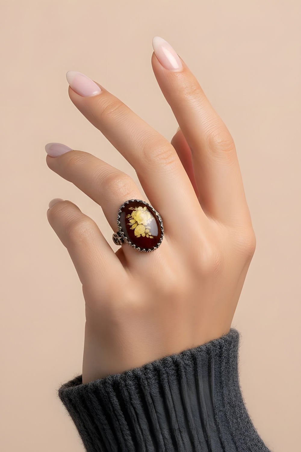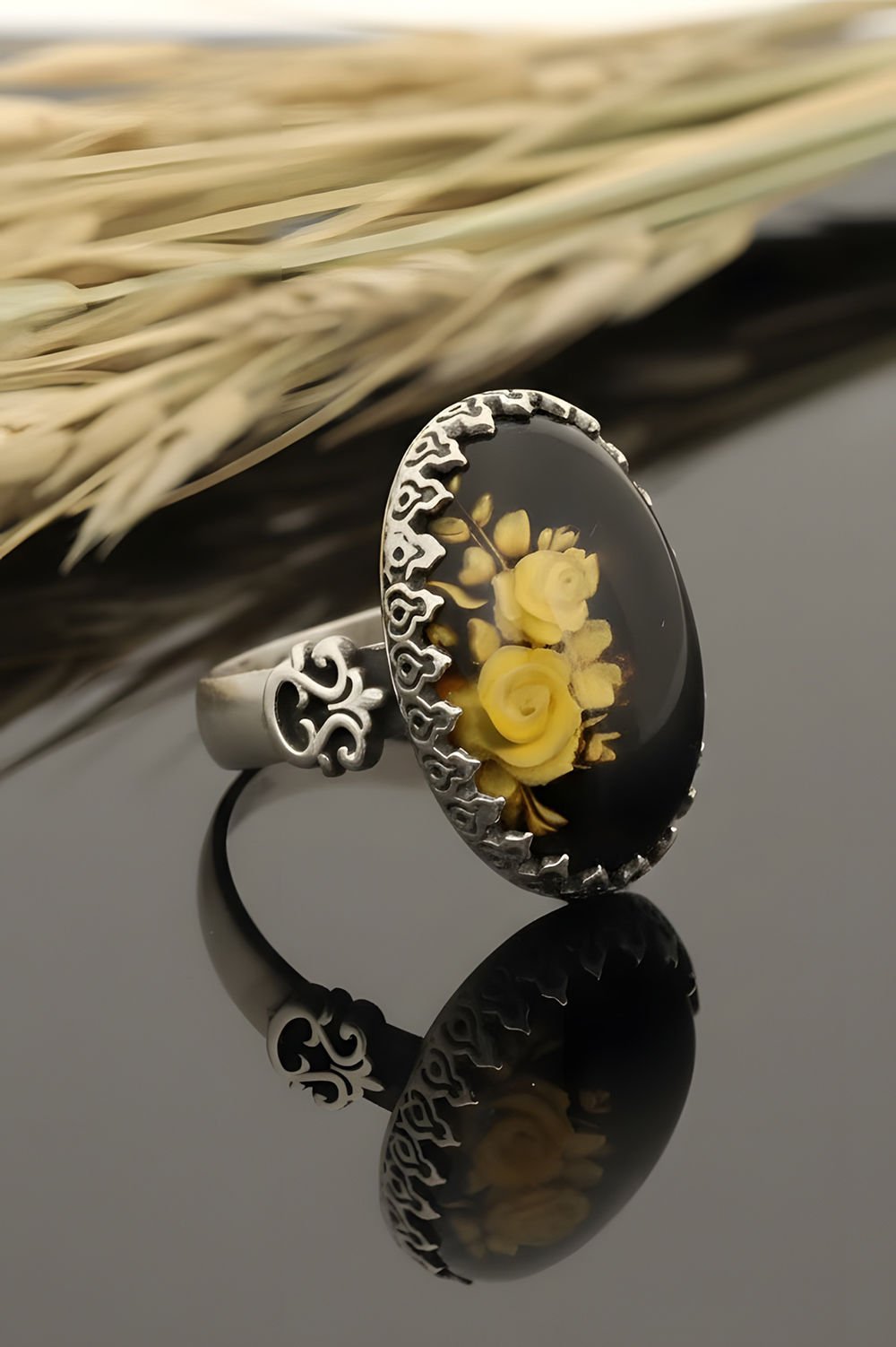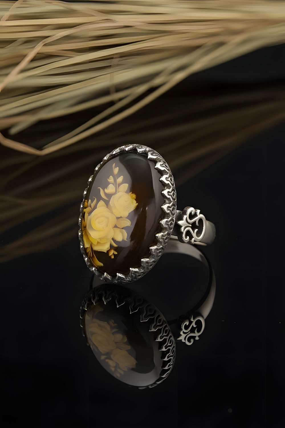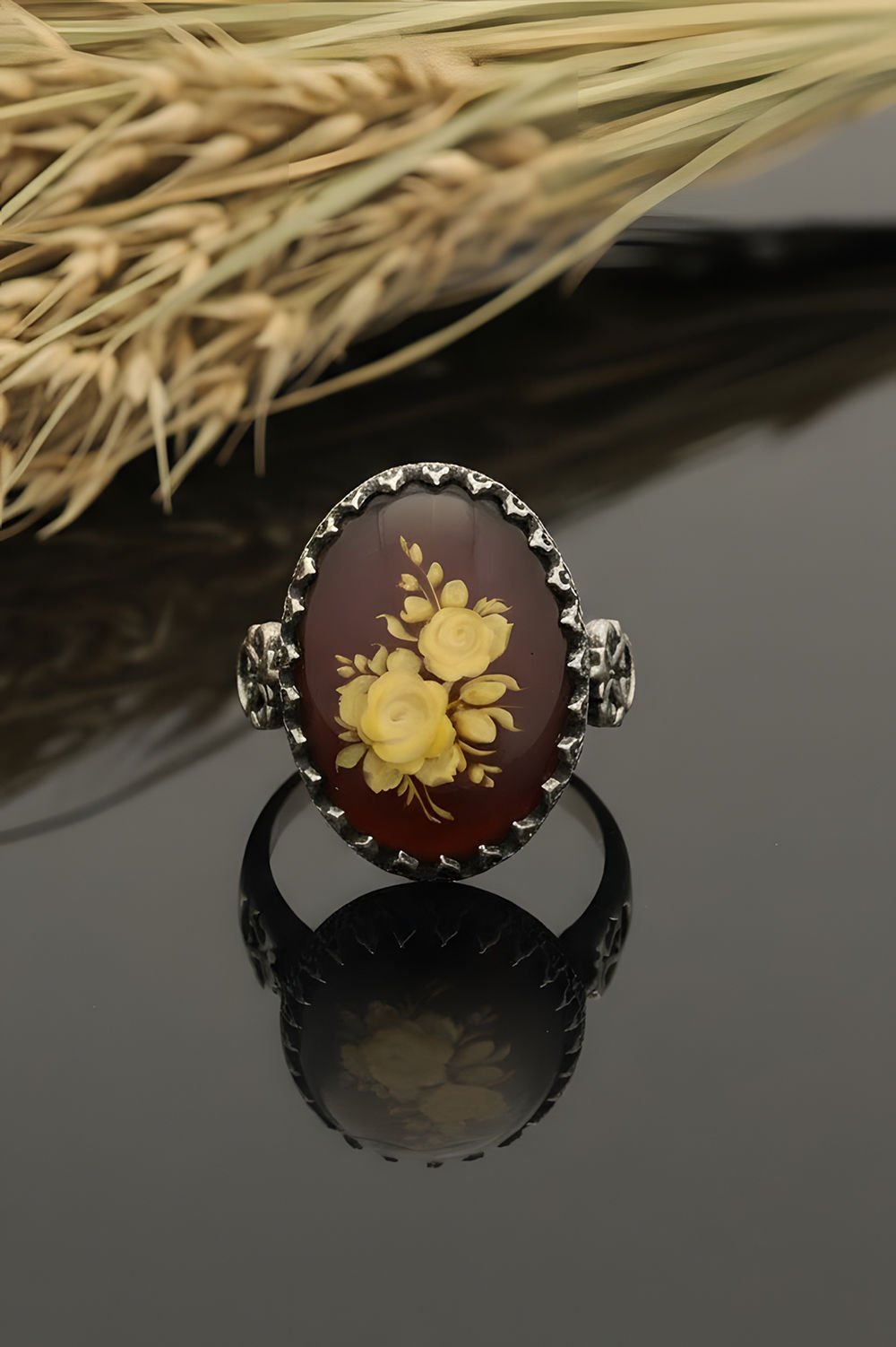 Damla Kehribar İçine Gül Oyma El İşi Gümüş Yüzük |