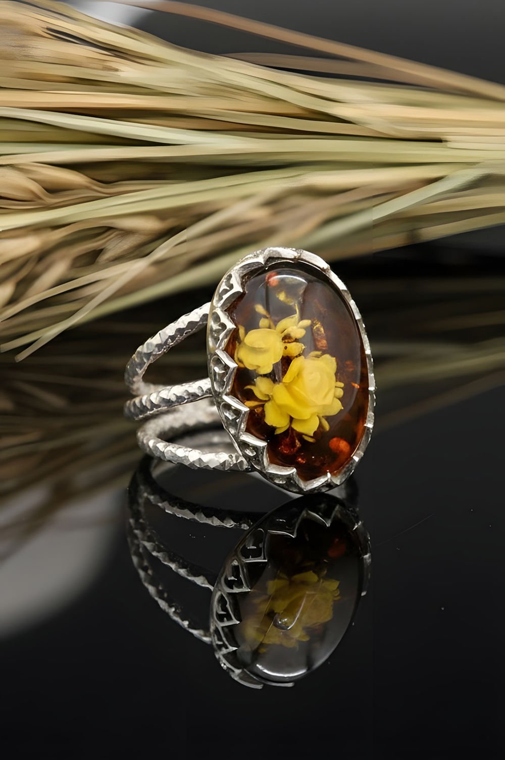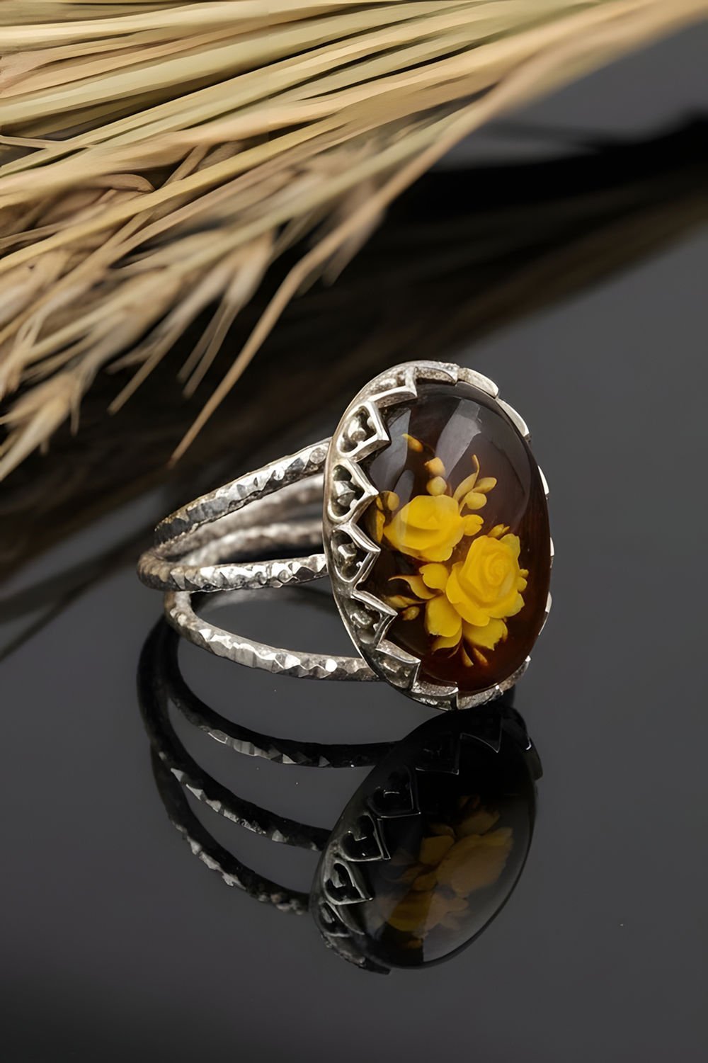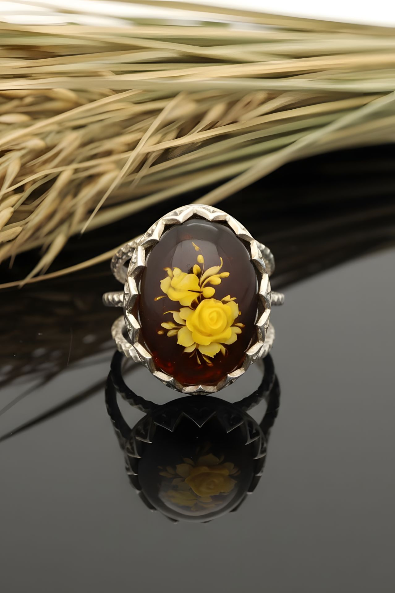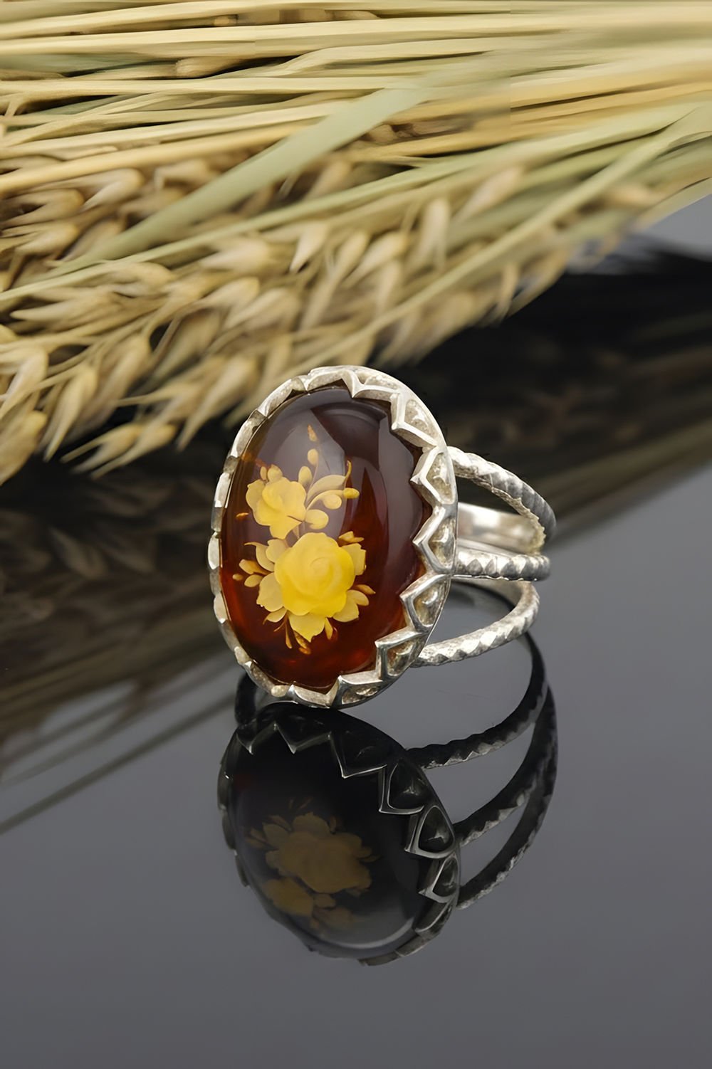 Damla Kehribar İçine Gül Oyma El İşi Gümüş Yüzük |
