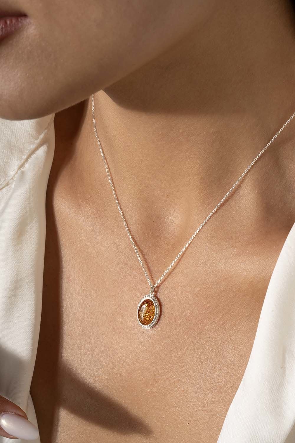 Doğanın sıcak dokunuşunu taşıyan bu gümüş kolye, zarif damla kehribar taşı ve özenle yapılmış el işçiliğiyle öne çıkıyor. Minimalist tasarımı, gümüşün sadeliğiyle buluşarak şıklığı ön plana çıkarıyor.