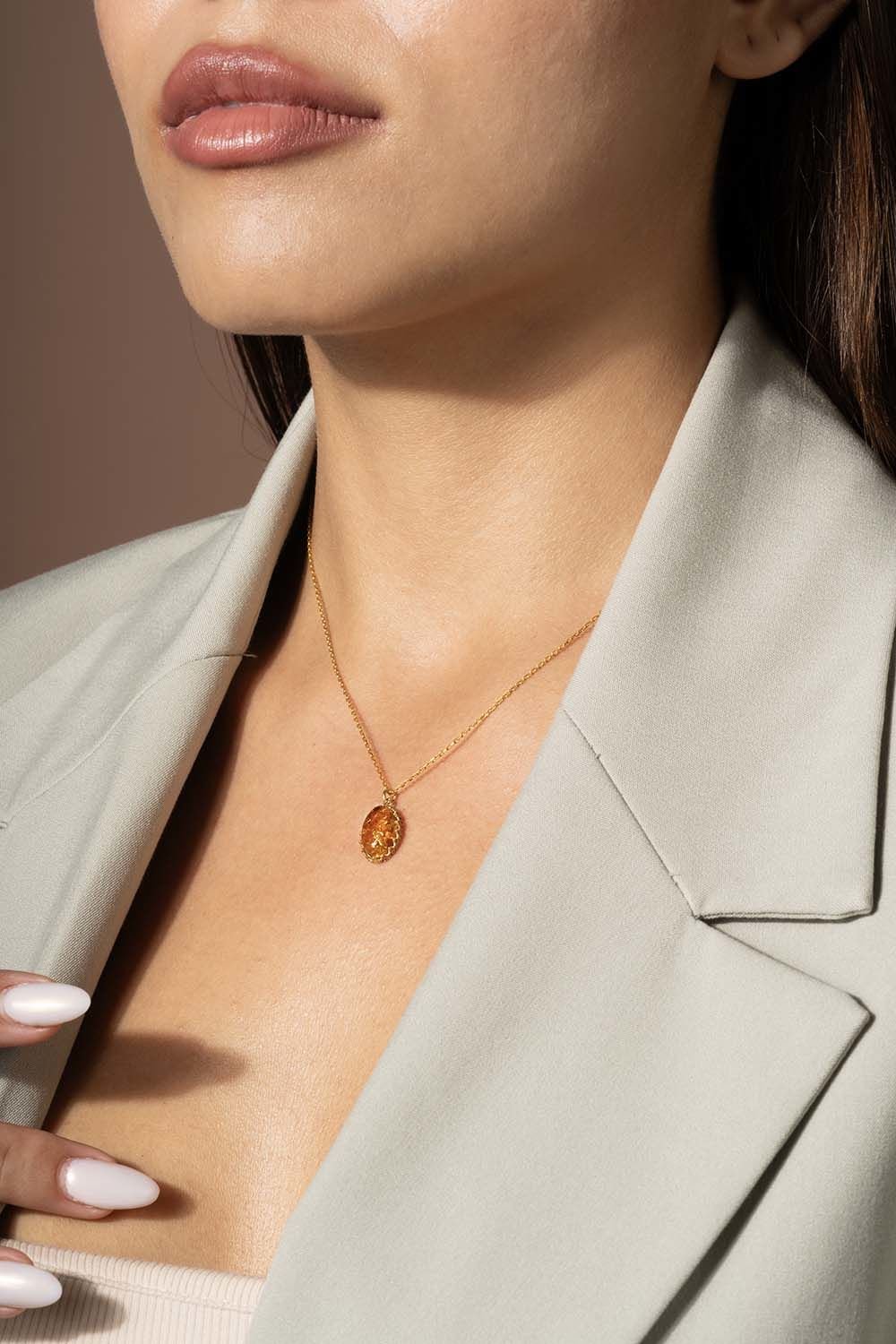 Damla Kehribar Taşlı Minimal Gümüş Kolye Altın Rengi