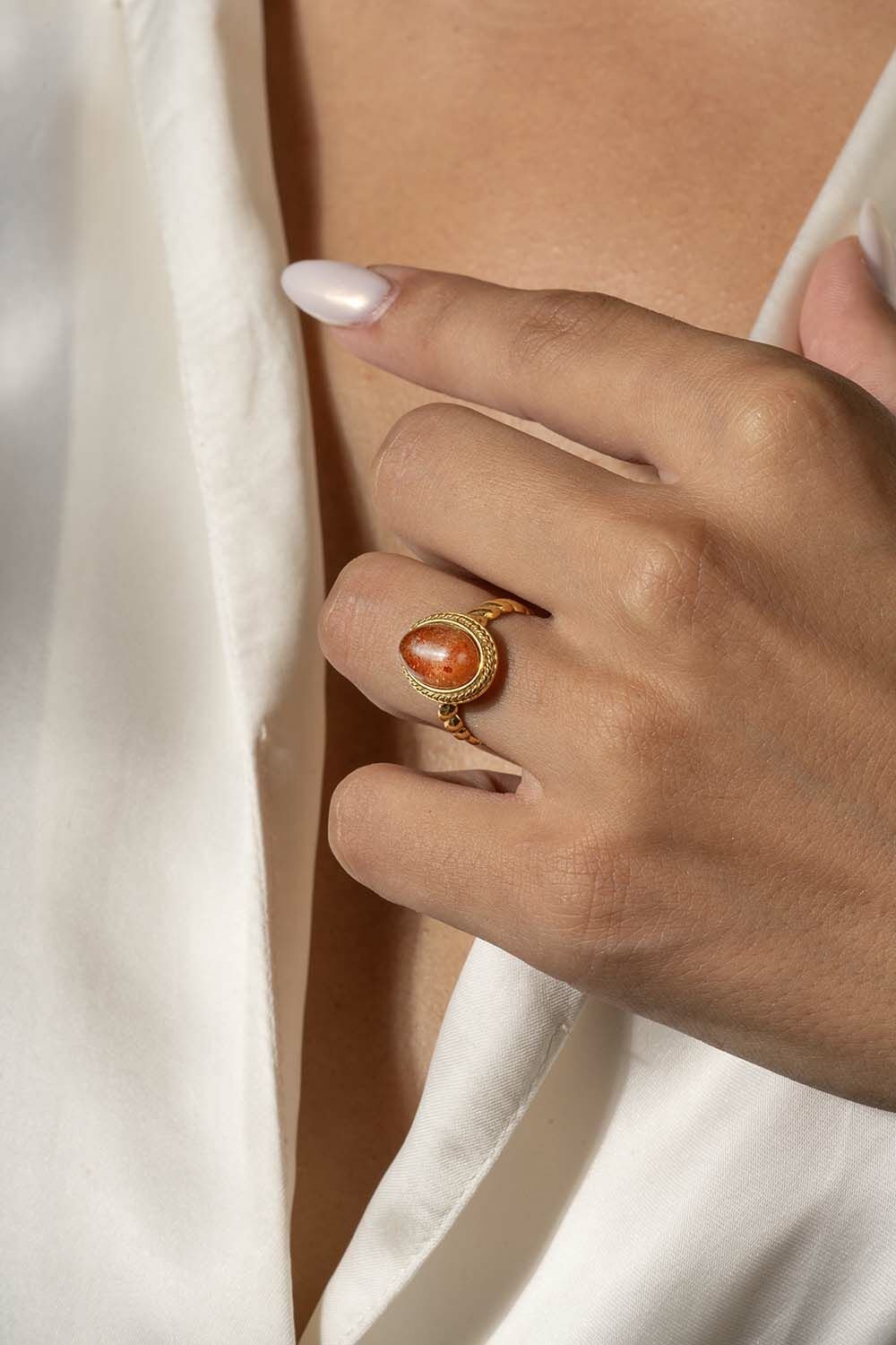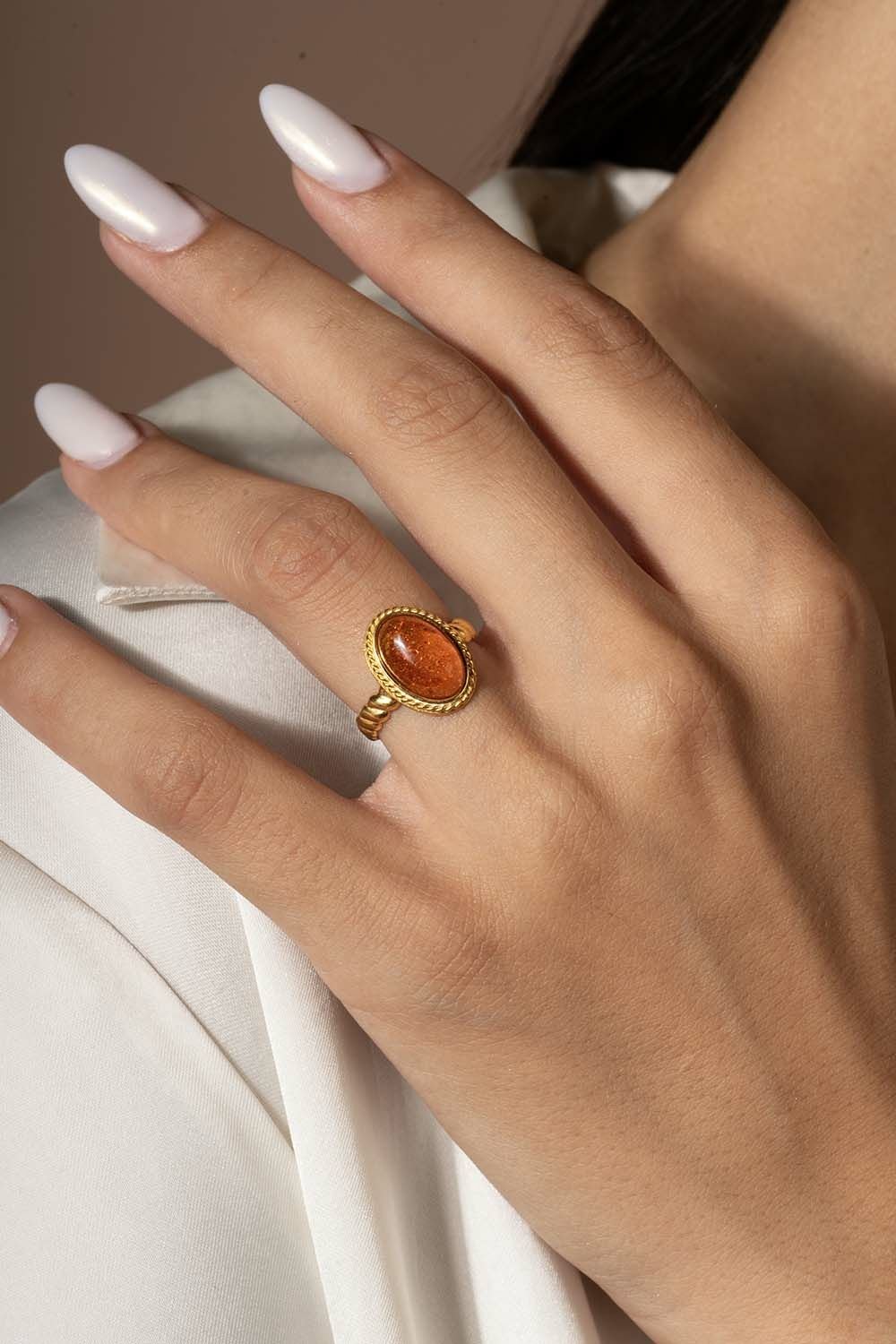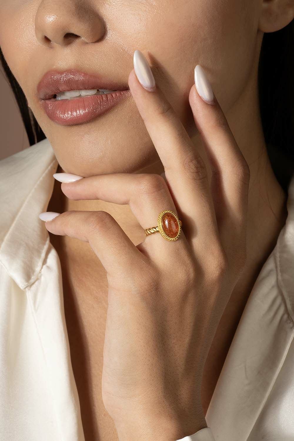 Damla Kehribar Taşlı Minimal Gümüş Yüzük Altın Rengi - 8