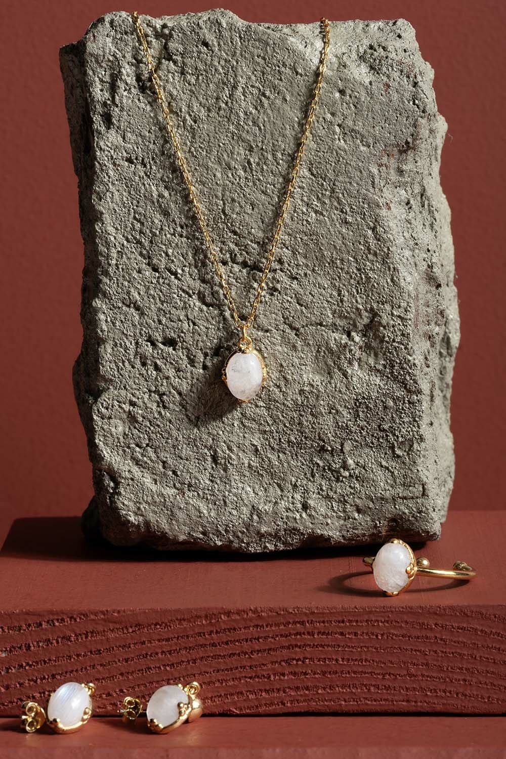 Doğal Ay Taşı Taşlı Minimal Gümüş Kadın Takı Seti Altın Rengi - 13