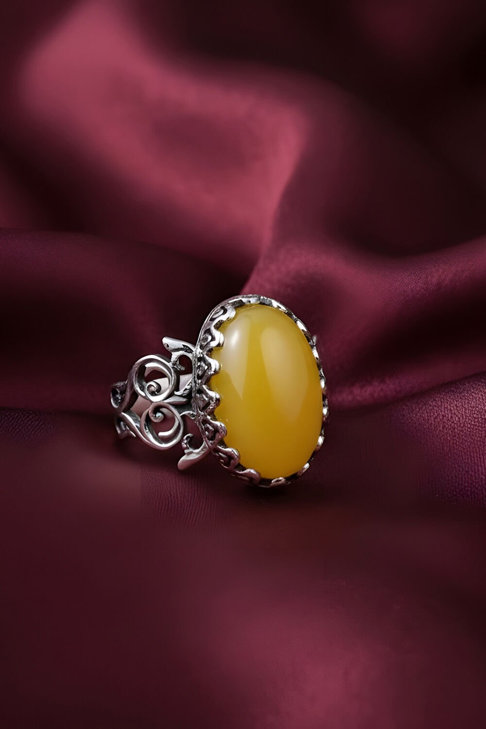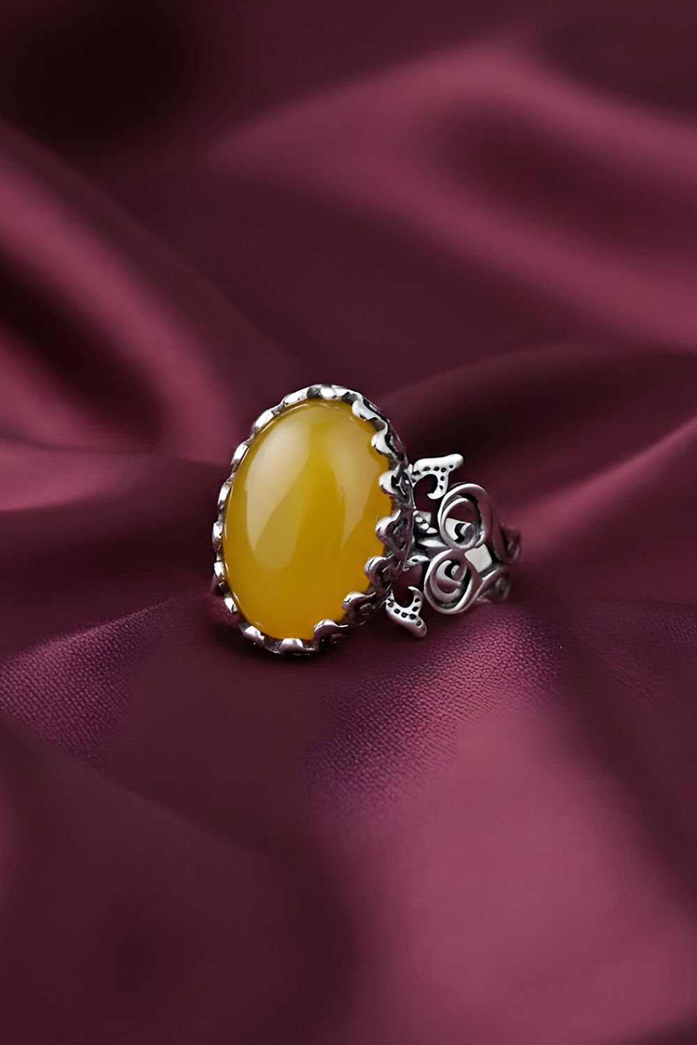 El İşçiliği Özel Tasarım Sarı Akik Taşlı 925 Ayar Gümüş Kadın Yüzük
