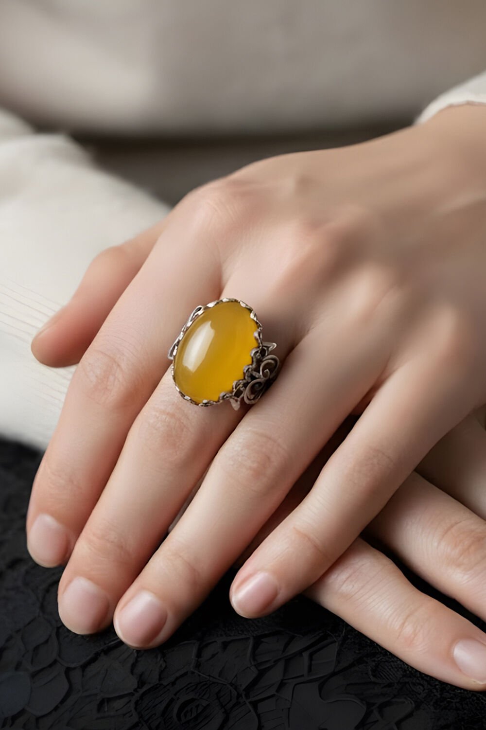 El İşçiliği Özel Tasarım Sarı Akik Taşlı Kadın Yüzük |