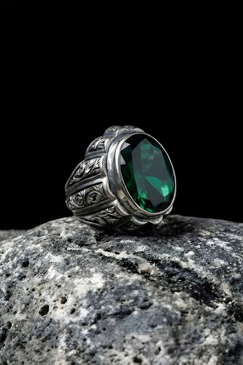 Erzurum Kalemkar Usta İşçiliği Yekta Model Zümrüt Zirkon Taşlı Erkek Yüzük |