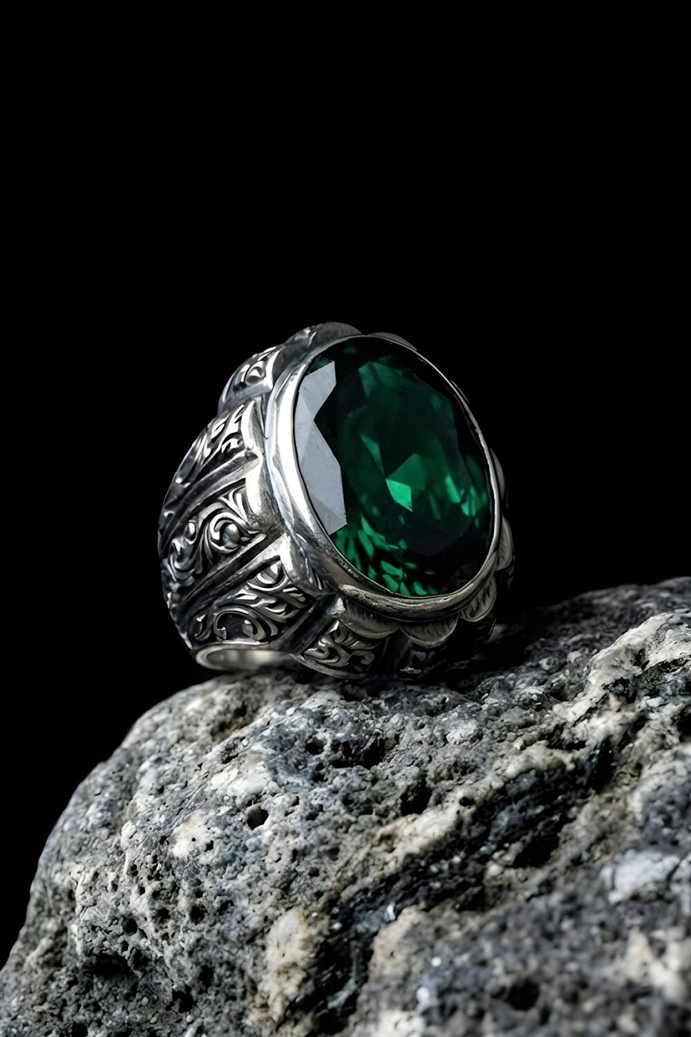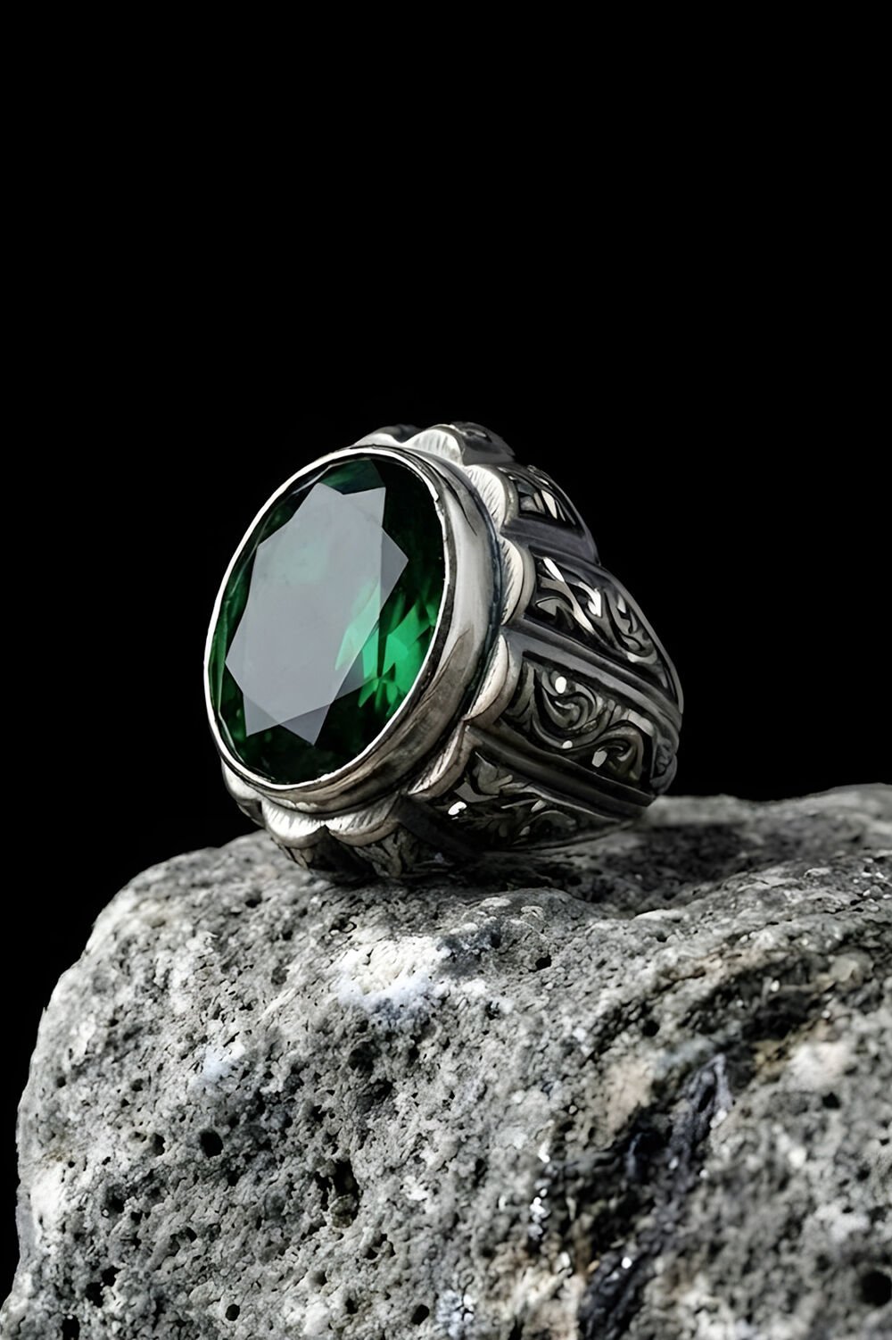 Erzurum Kalemkâr Usta İşçiliği: Yekta Model Zümrüt Zirkon Taşlı Gümüş Erkek Yüzük