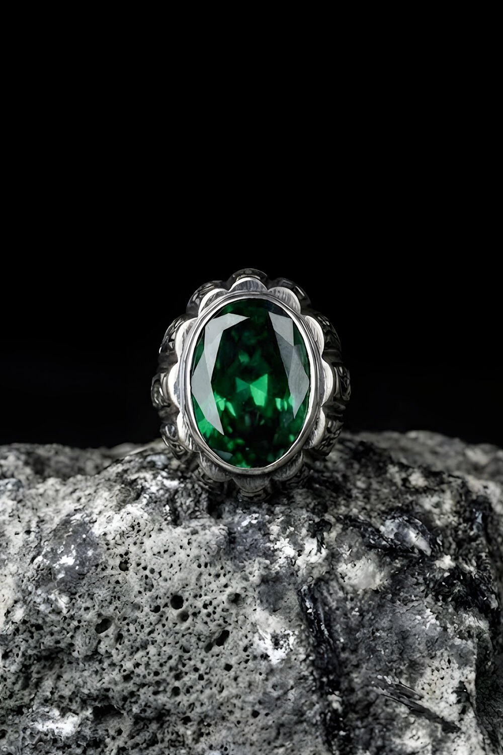 Yüzüğün merkezinde parlayan zümrüt zirkon taş, gümüşün asil tonuyla mükemmel bir kontrast oluşturur. 925 ayar gümüş kullanılarak üretilen bu özel tasarım, 20,40 gramlık ağırlığıyla hem heybetli hem de konforlu bir kullanım sunar.