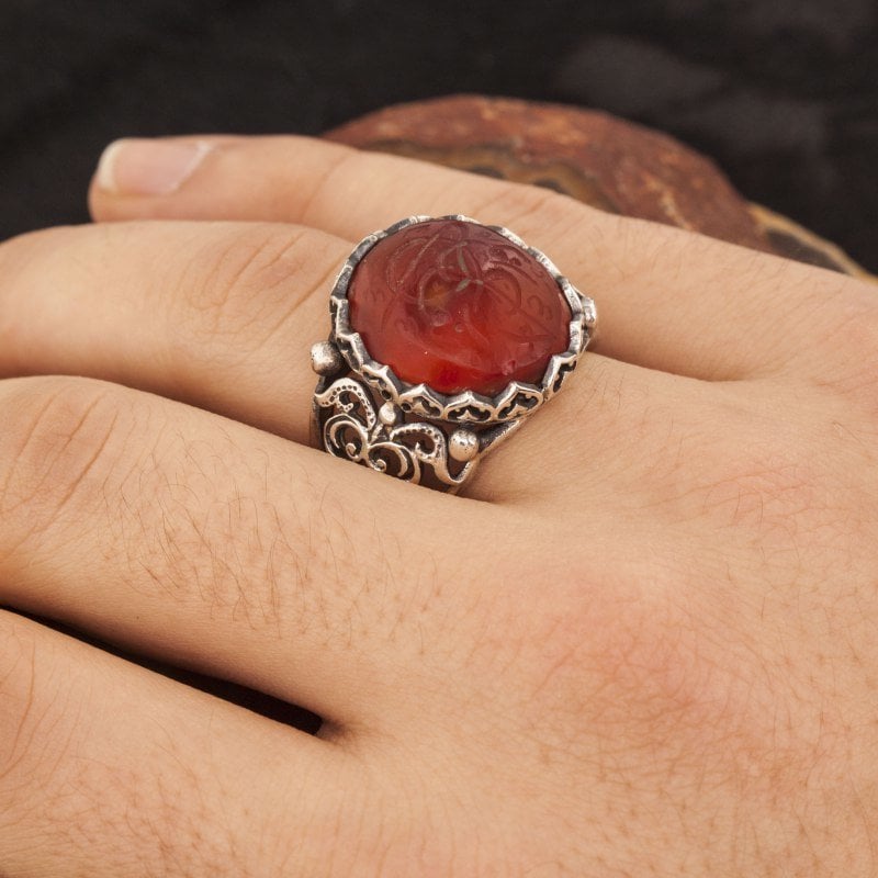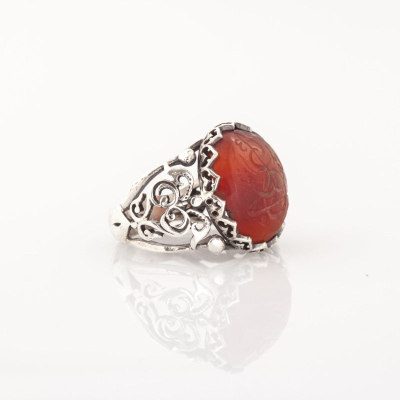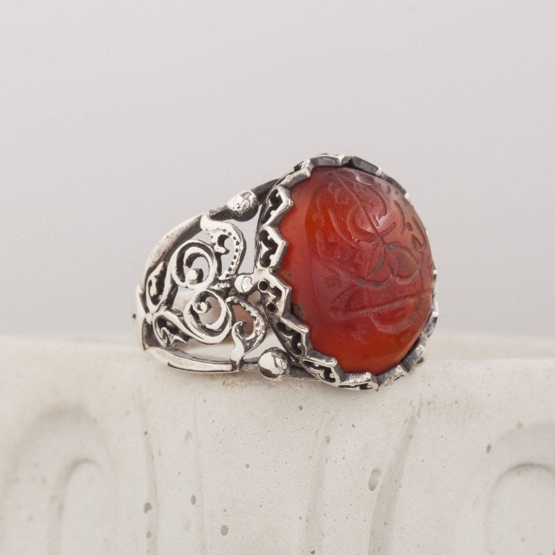 Doğal Akik Taşlı El İşçiliği 925 Ayar Gümüş Yüzük Özel İşçilik "Nurun Ala Nur" Yazılı Kakma Eski Tasarım ile stilinizi ifade edin. Bu benzersiz mücevher, güzellik ve anlamı bir araya getirerek sizi özel kılacaktır.