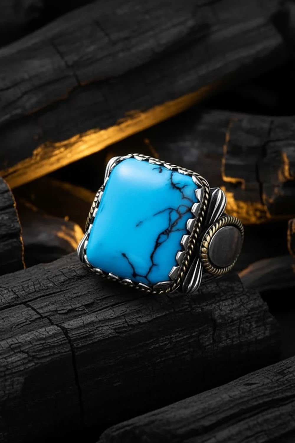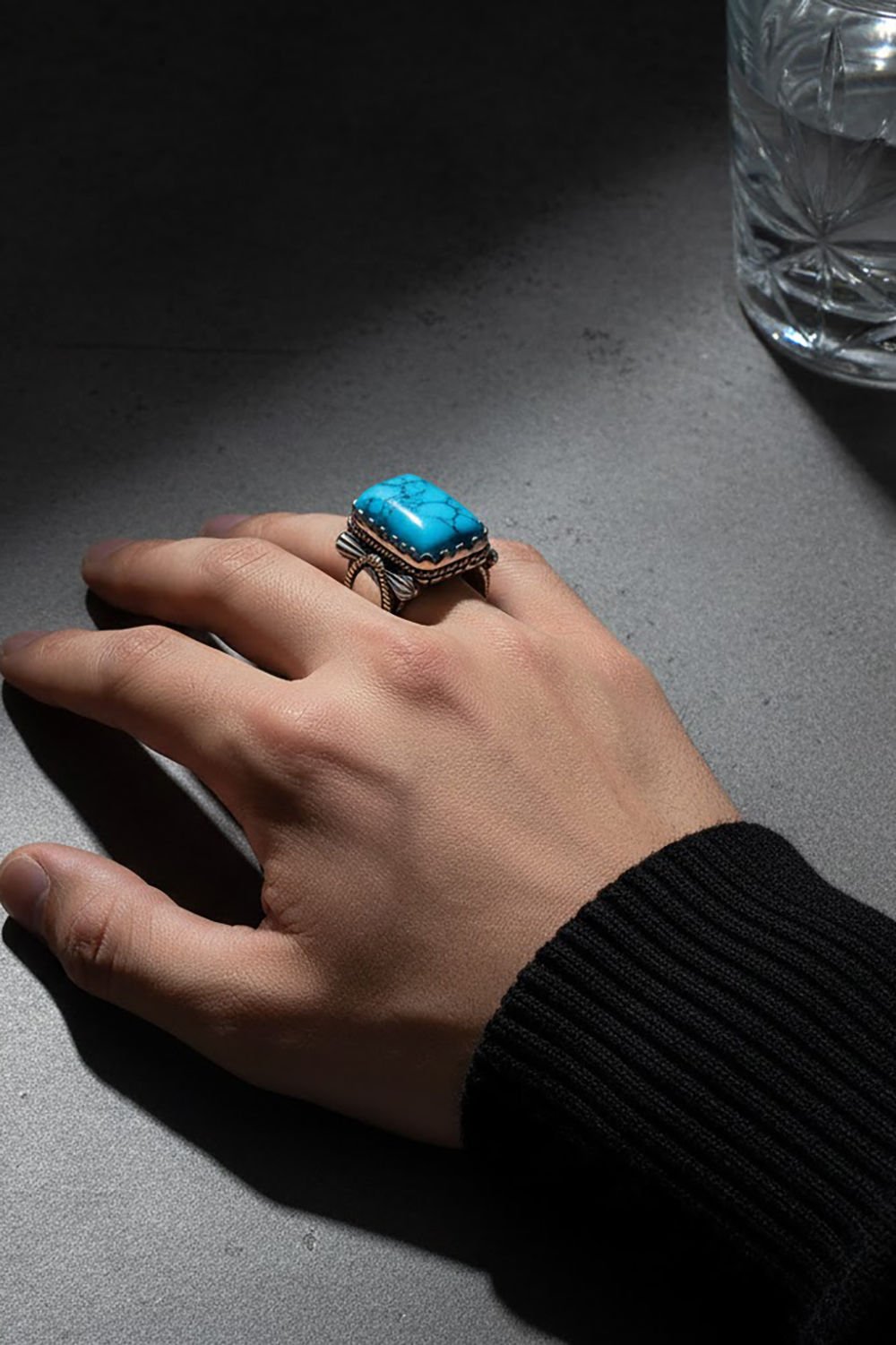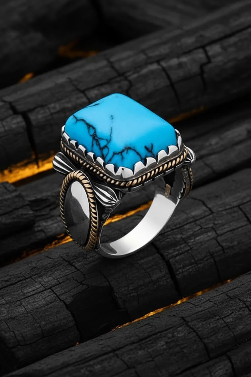 Bu özel erkek yüzüğü, doğal firuze taşı ve el işçiliği ile 925 ayar gümüşten üretilmiştir. Her detayı ustalıkla işlenmiş olan bu yüzük, zarafeti ve benzersizliği bir araya getiriyor.