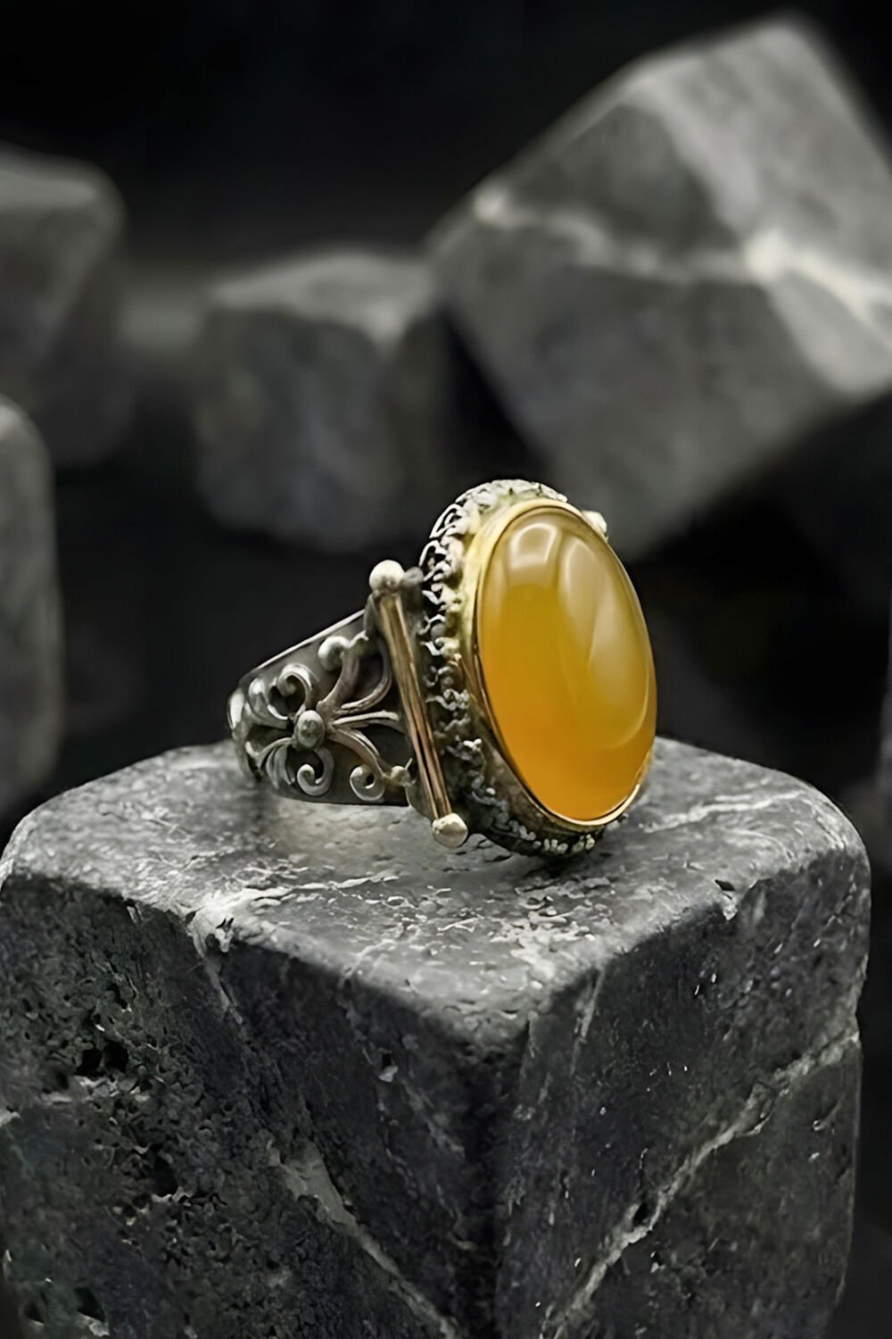Görkem Model El İşi Sarı Akik Taşlı Gümüş Erkek Yüzük