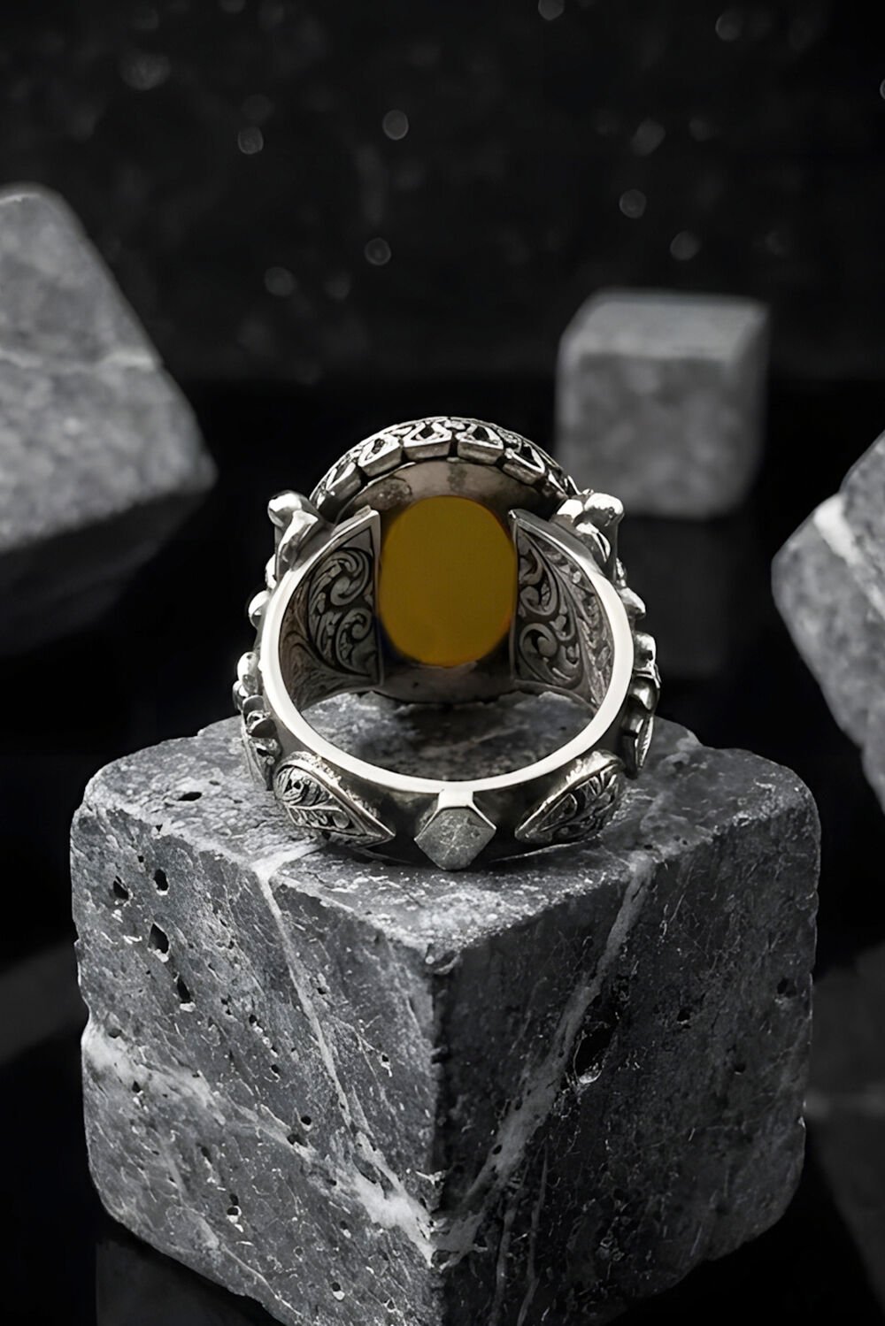 Görkem Model El İşi Sarı Akik Taşlı Gümüş Erkek Yüzük |