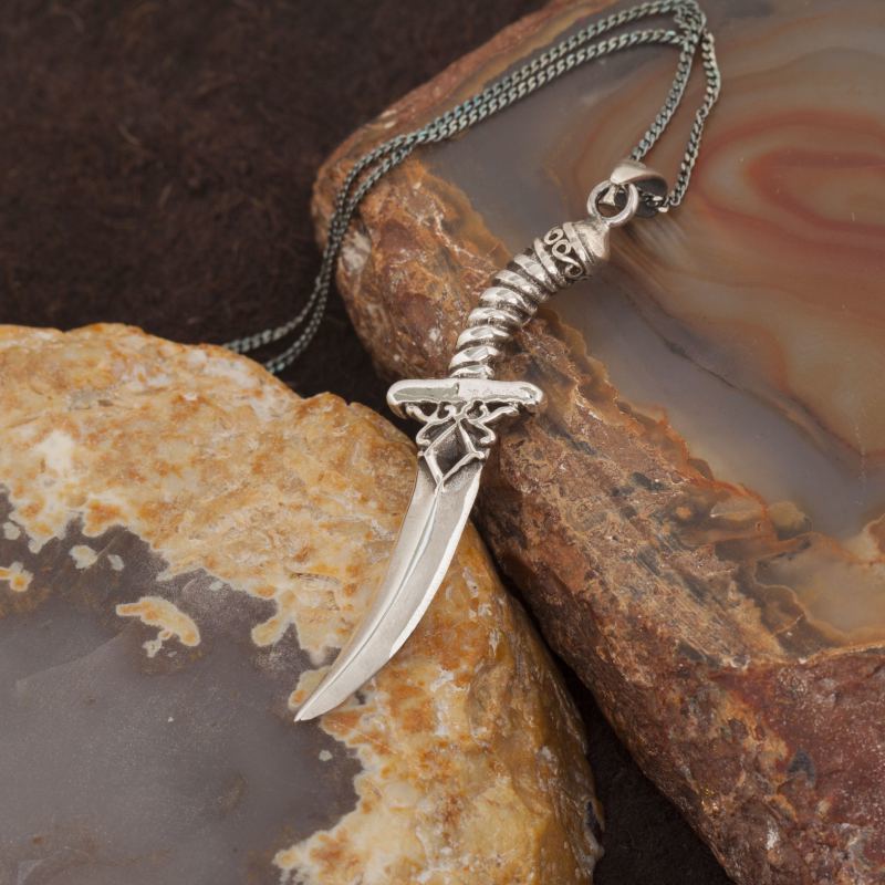 Hançer figürünü kullandığımız gümüş kolye modelimiz. Kolye, 925 ayar gümüş ve kendi atölyemizin işçiliği ile hazırlanmıştır. Sipariş verildikten sonra 1-2 iş günü içerisinde kargoya verilir.