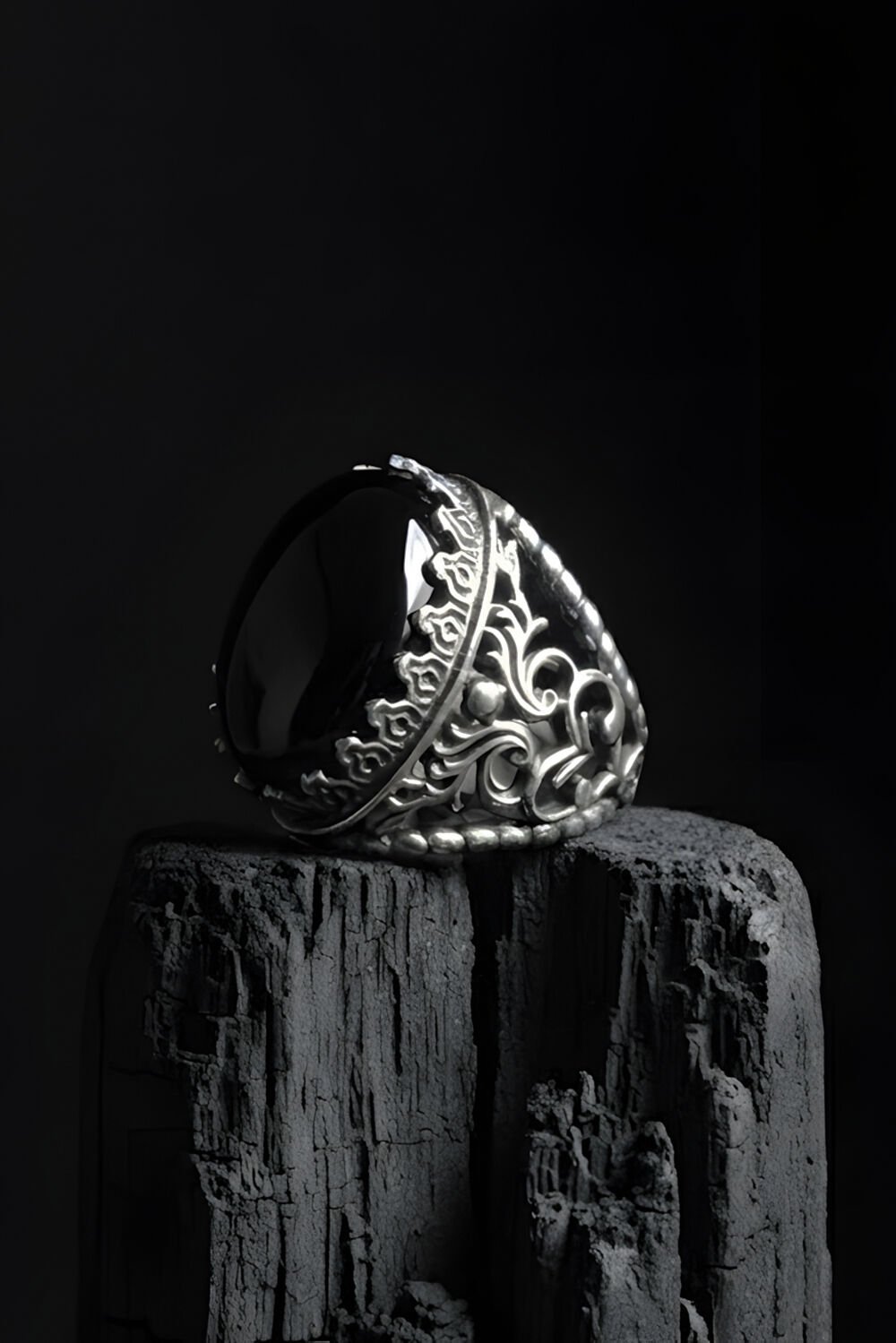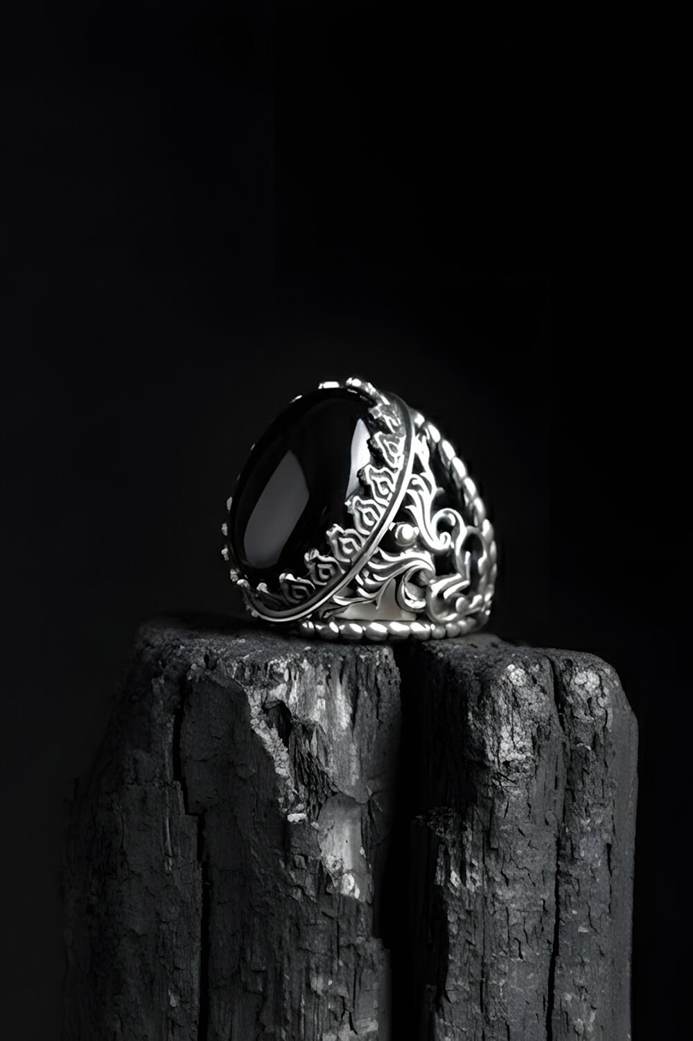 Har-ı Aşk Serisi: El İşçiliği Doğal Oniks Taşlı 925 Ayar Gümüş Erkek Yüzük