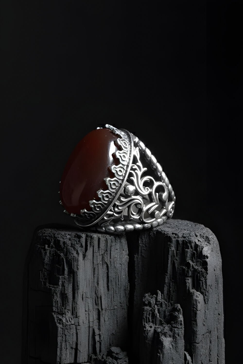 925 ayar gümüşün ağırlığını ve kalitesini her detayında hissedeceğiniz bu yüzük, yaklaşık 17,30 gram ağırlığıyla tok bir duruş sergiler. 18x25 mm boyutlarındaki göz alıcı akik taşı, çevresindeki ince kalem işçiliği ve "Har-ı Aşk" (Aşk Ateşi/Dikeni) temalı işlemeleriyle sıradan bir aksesuardan çok daha fazlası; bir imza niteliğindedir.