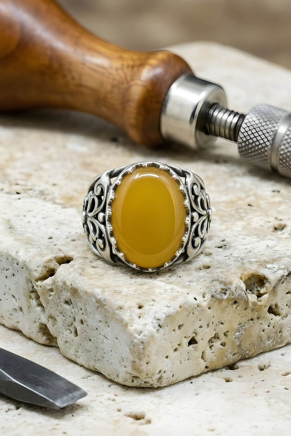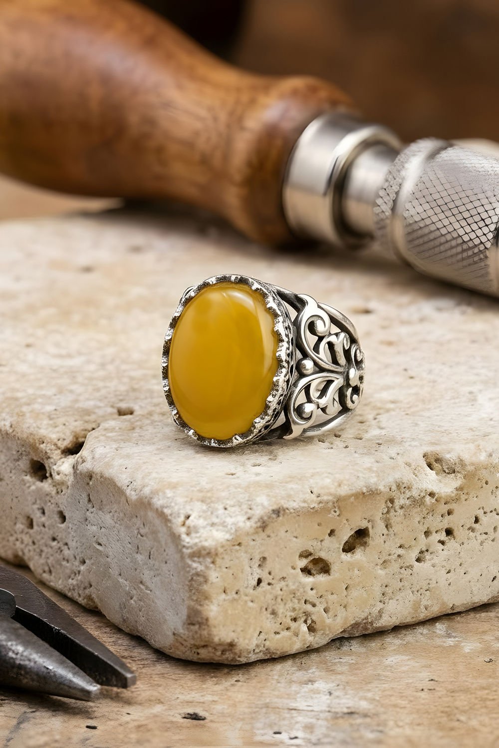 Hünkar Model El İşi Sarı Akik Taşlı Gümüş Yüzük