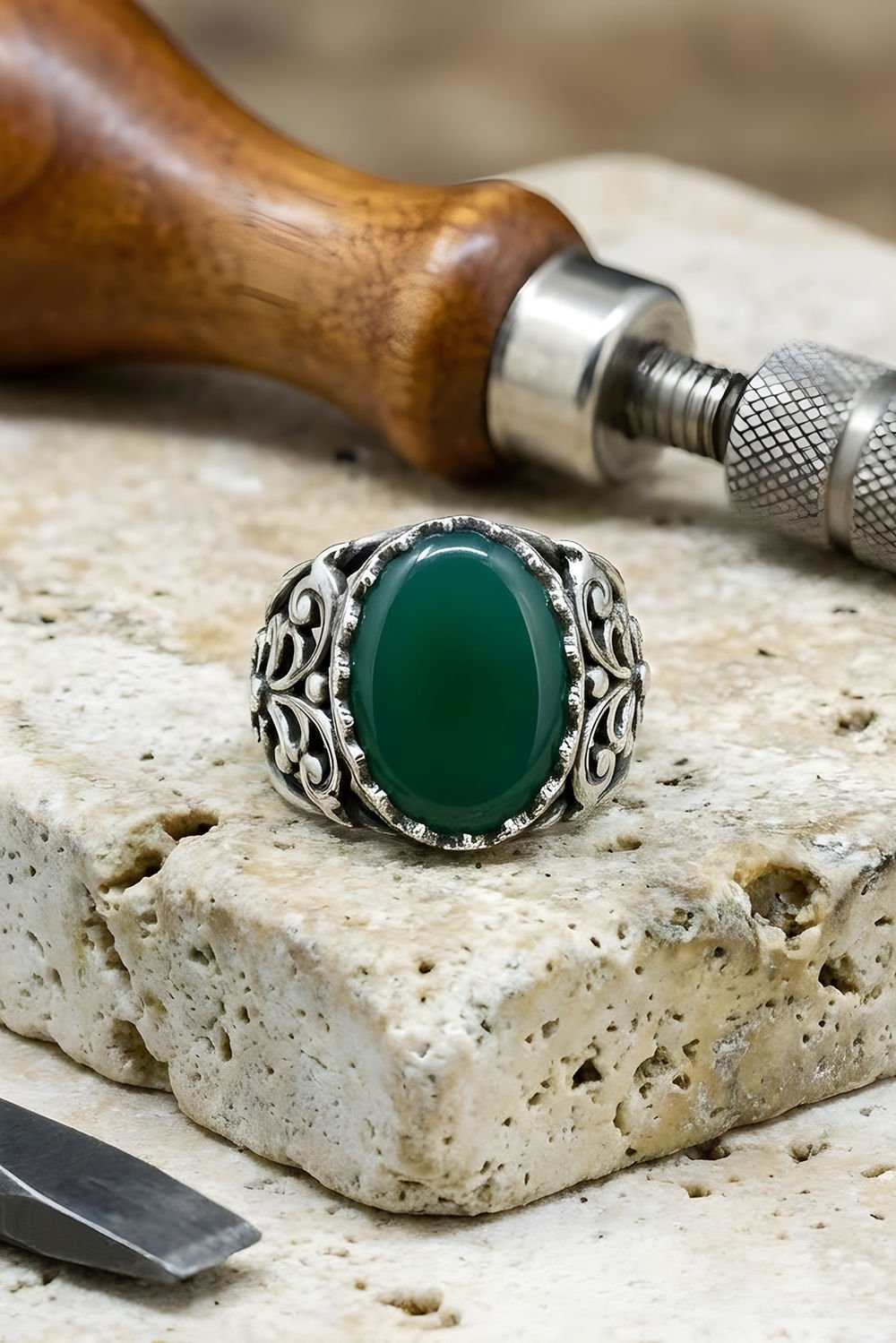 Hünkar Model El İşi Yeşil Akik Taşlı Gümüş Yüzük |