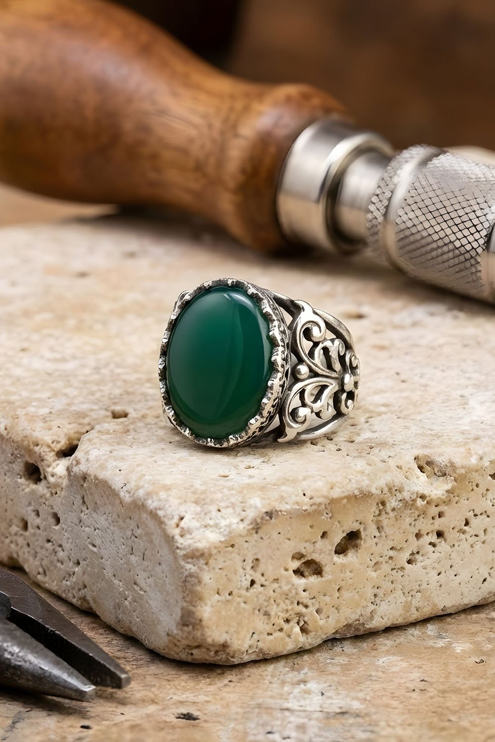 Hünkar Model El İşi Yeşil Akik Taşlı Gümüş Yüzük