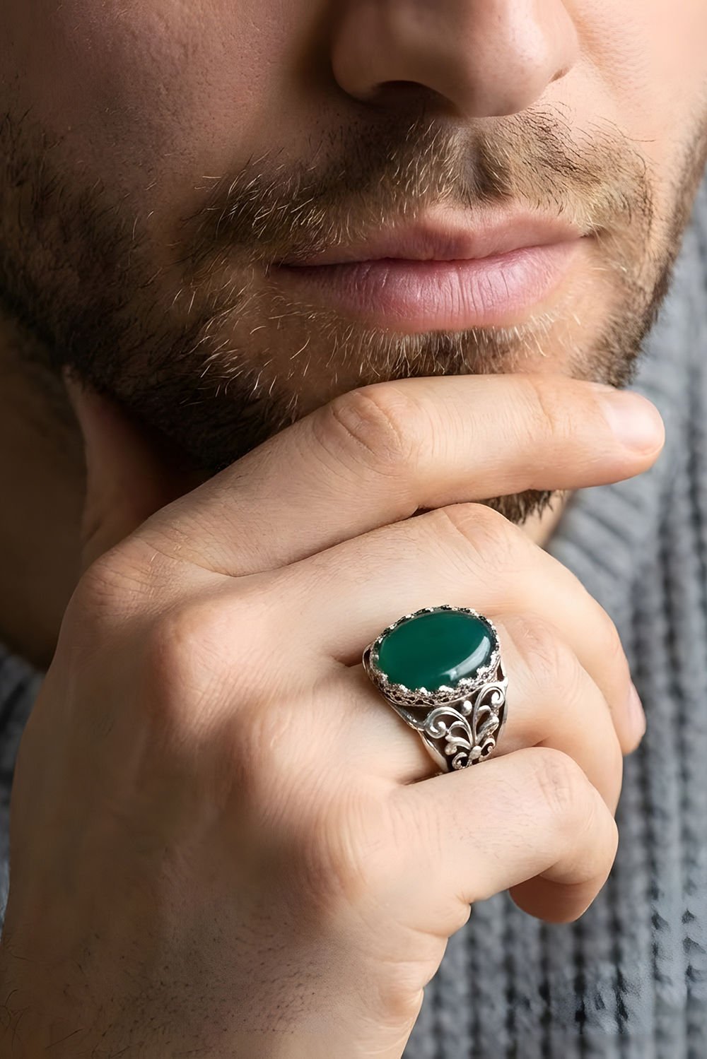 Yeşil Akik, doğada huzur ve şans getirdiğine inanılan en değerli taşlardan biridir. Hünkar modelinin heybetli duruşu, bu doğal taşın sakinleştirici yeşil tonlarıyla birleşerek hem günlük kullanımda hem de özel davetlerde tarzınızı tamamlar. 18 gramı aşan ağırlığı ile parmağınızda kaliteyi ve dolgunluğu hissettirir.