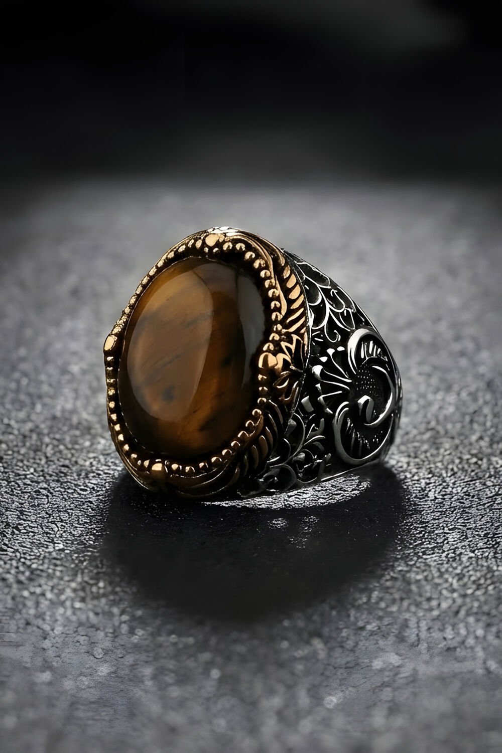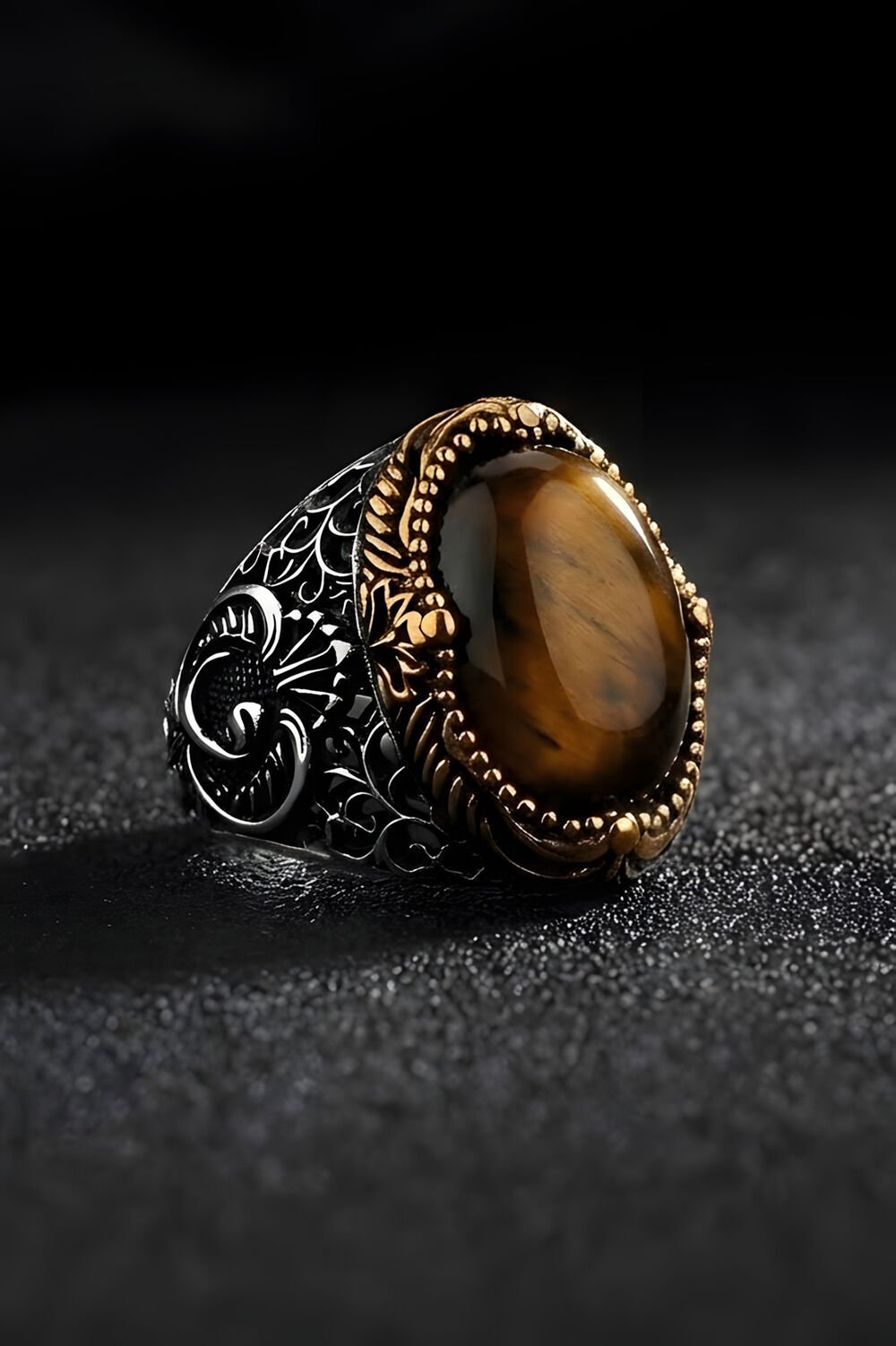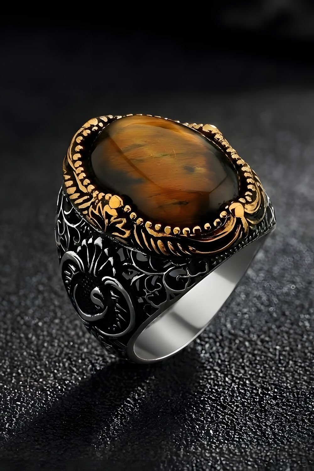 Doğal kaplangözü taşının büyüleyici haresiyle tanışın! 925 ayar gümüş Hünkar model erkek yüzük, özel atölye işçiliği ve şık hediye paketiyle Takıdepo'da sizi bekliyor.