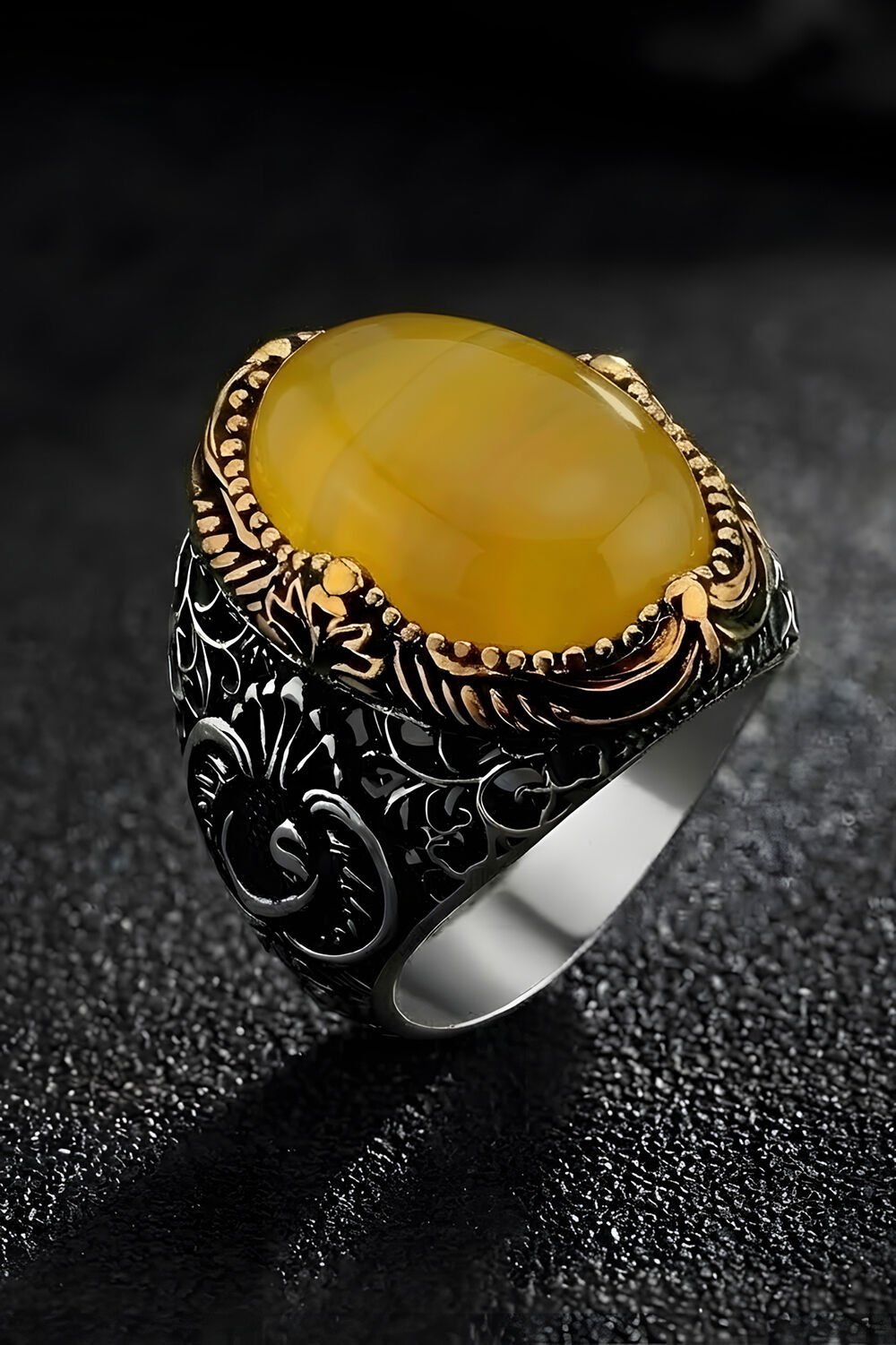 Hünkar Model Sarı Akik Taşlı Gümüş Erkek Yüzük |