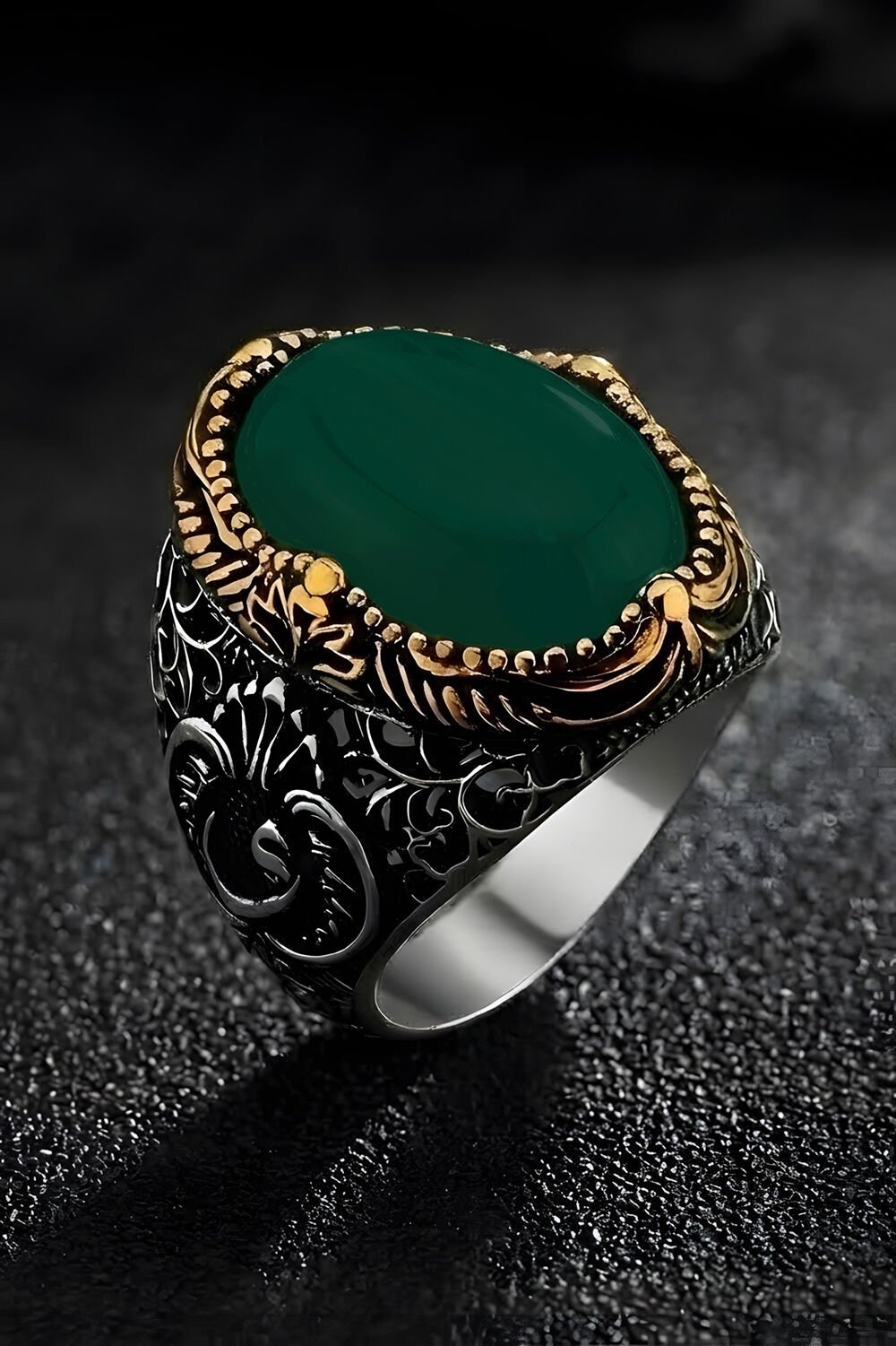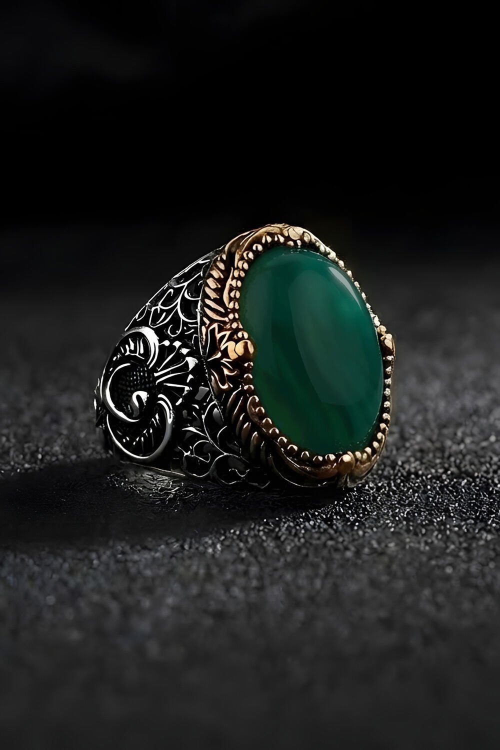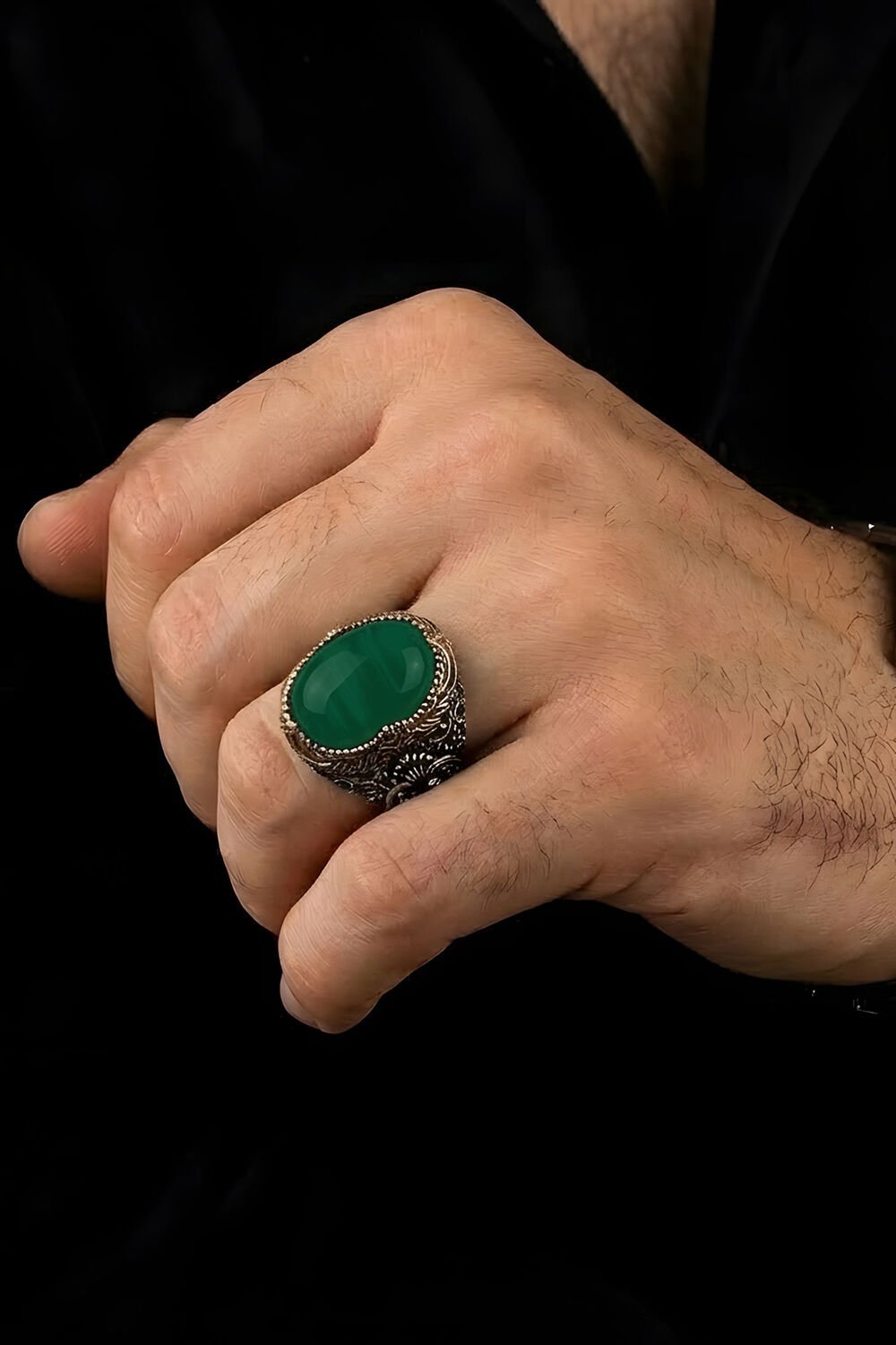 Hünkar Model Yeşil Akik Taşlı Gümüş Erkek Yüzük