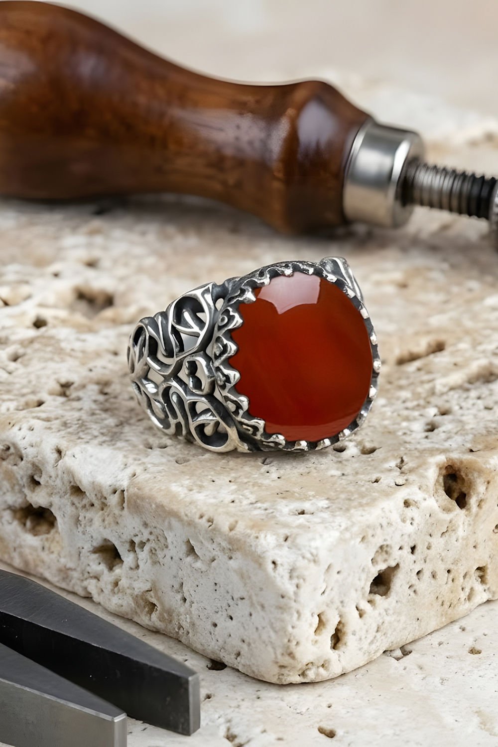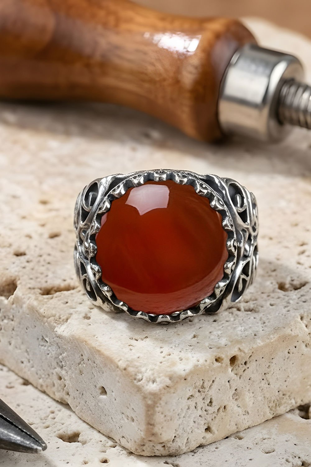 Kadim Model El İşi Akik Taşlı Gümüş Yüzük
