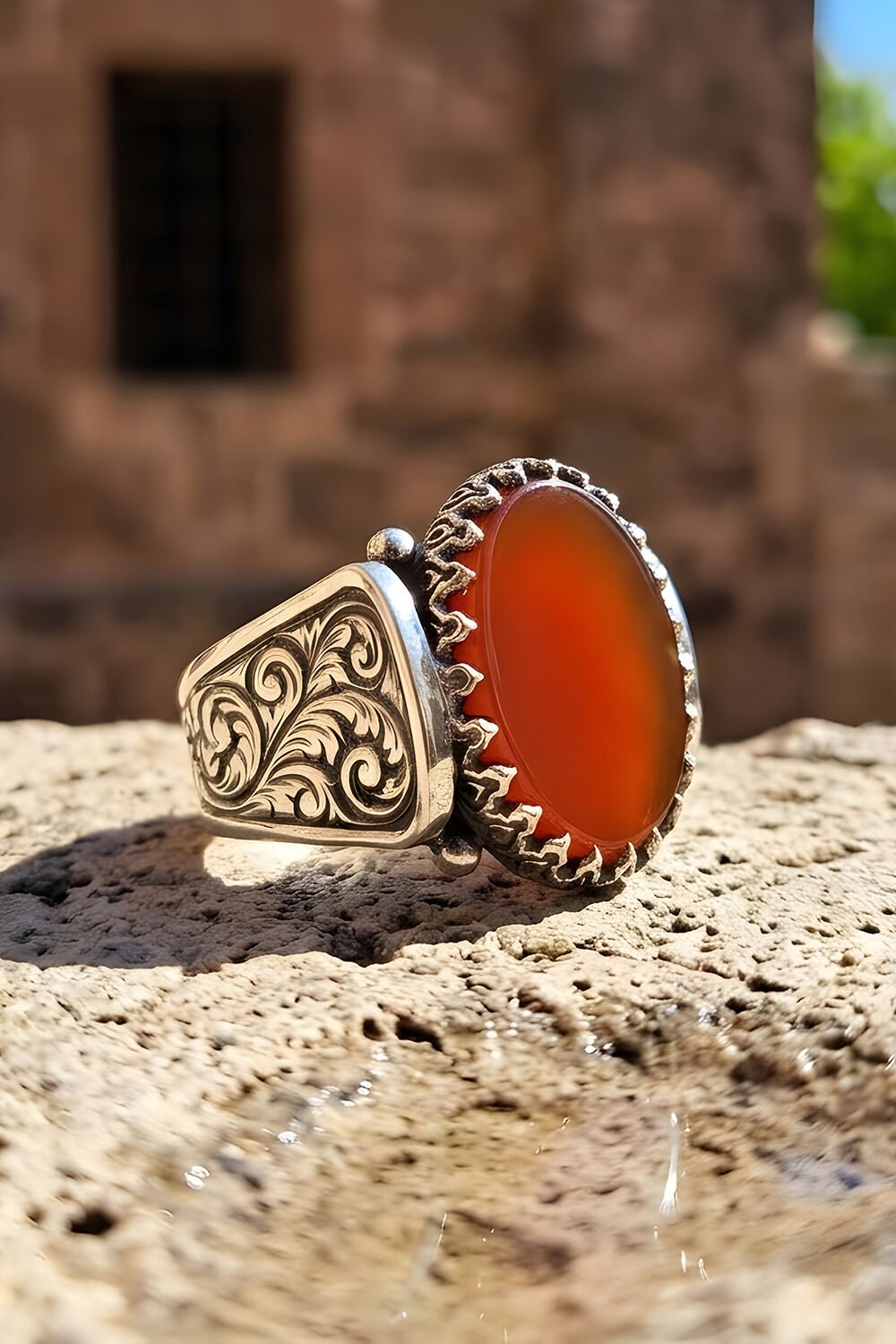 Tarzını sıradanlıktan kurtarıp asil bir dokunuşla tamamlamak isteyen erkekler için tasarlanan bu özel yüzük, 925 ayar gümüşün zarafetini ve doğal akik taşının enerjisini bir araya getiriyor. Tamamen el işçiliği ile hazırlanan bu eser, üzerindeki ince kalem işleme desenleriyle geleneksel kuyumculuk sanatının en seçkin örneklerinden birini sunuyor.