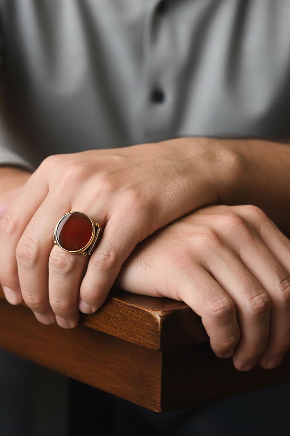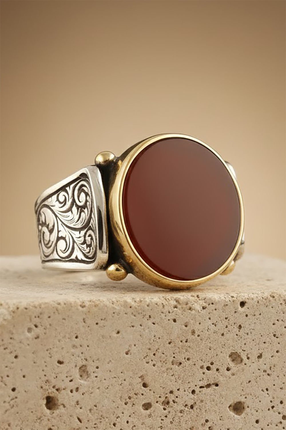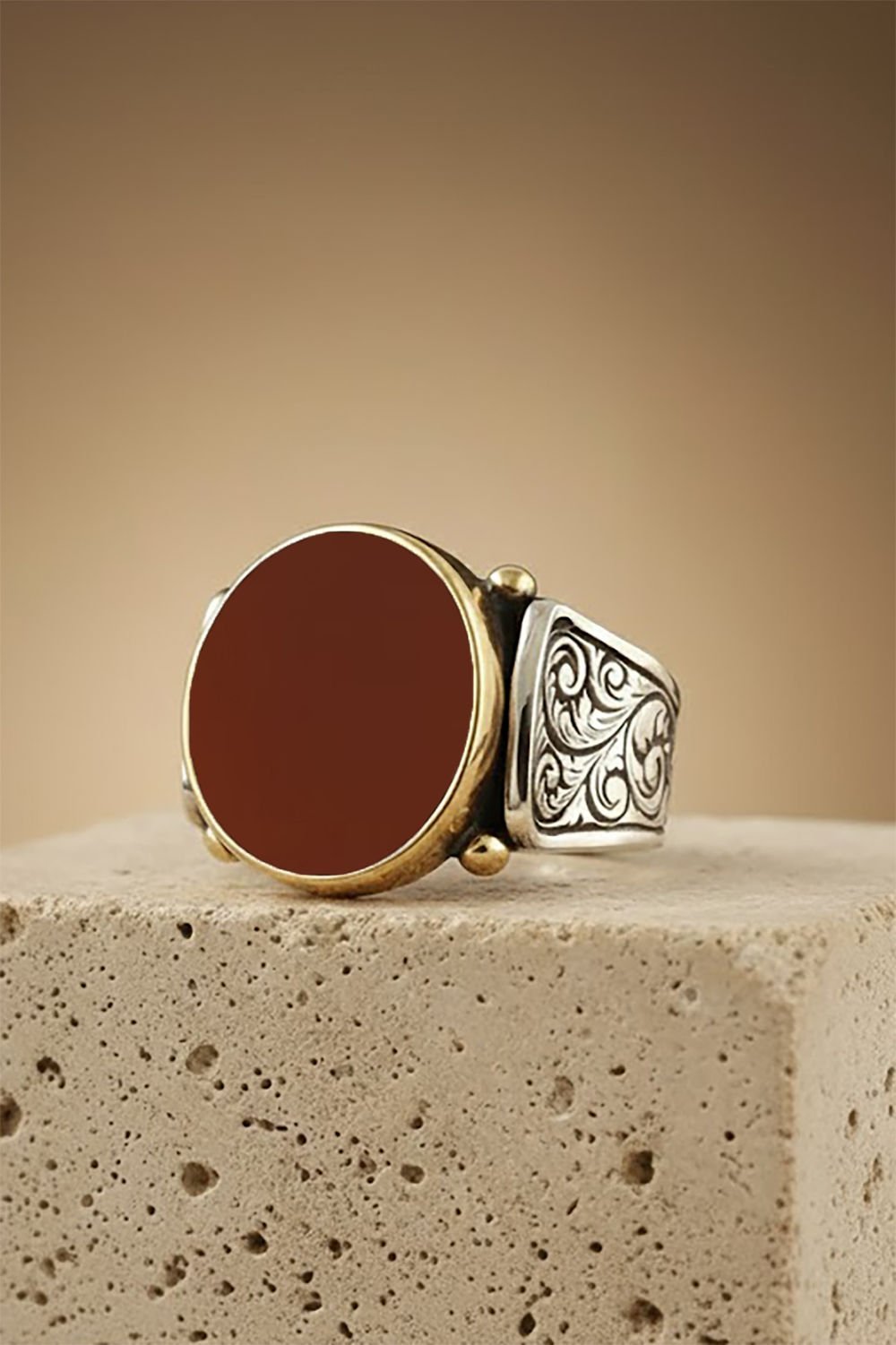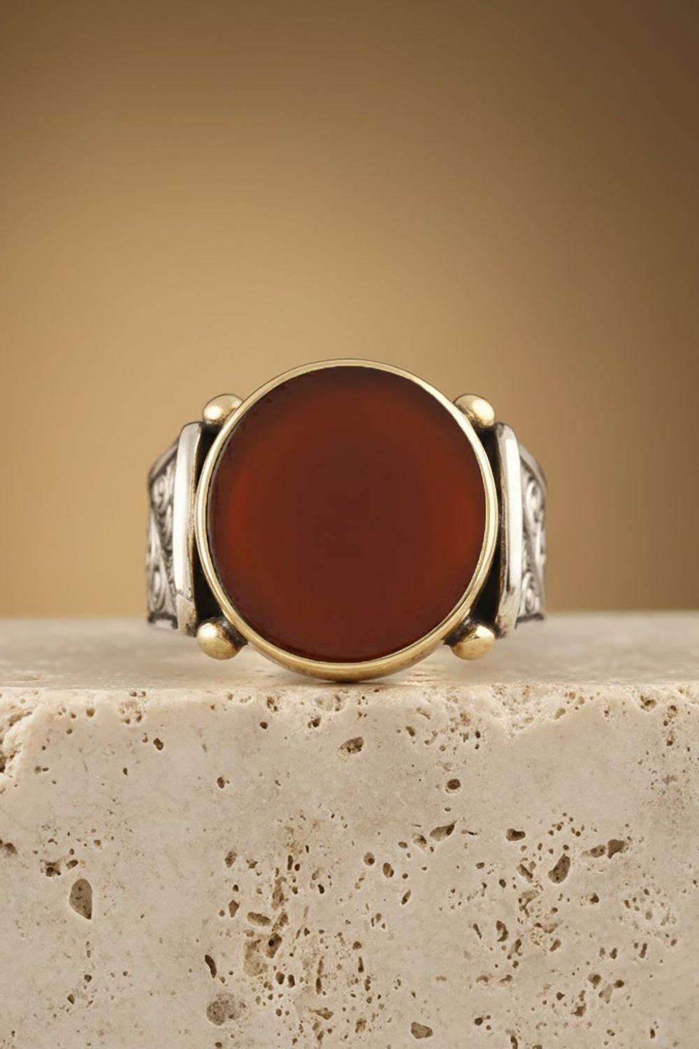 Hakiki ve orijinal doğal taşlar kullandığımız yüzüklerin bu modelinde klasik rengiyle Akik taşını kullanıyoruz.