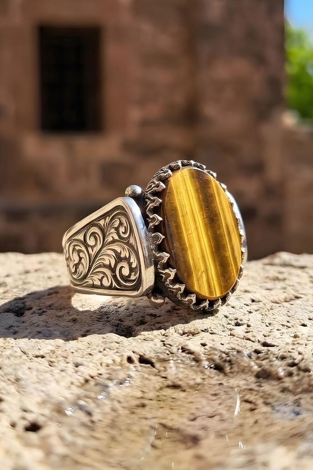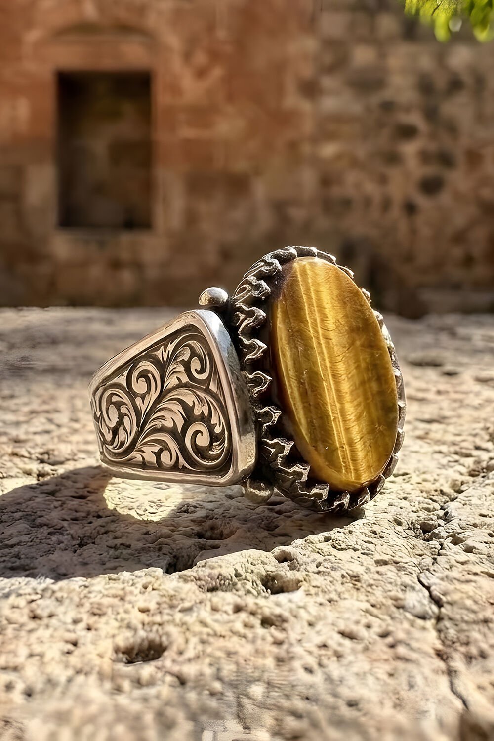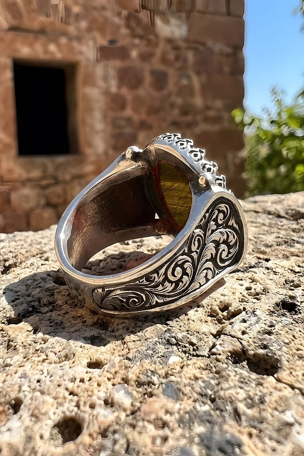 Kalem İşleme Desenli Kaplangözü Taşlı Gümüş Erkek Yüzük |