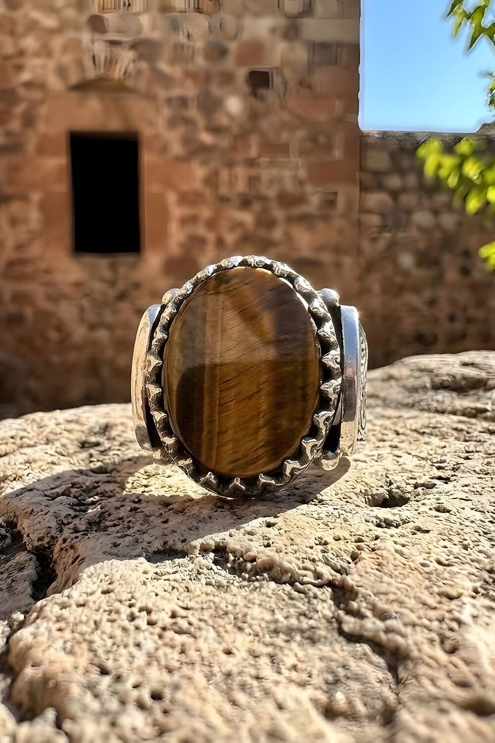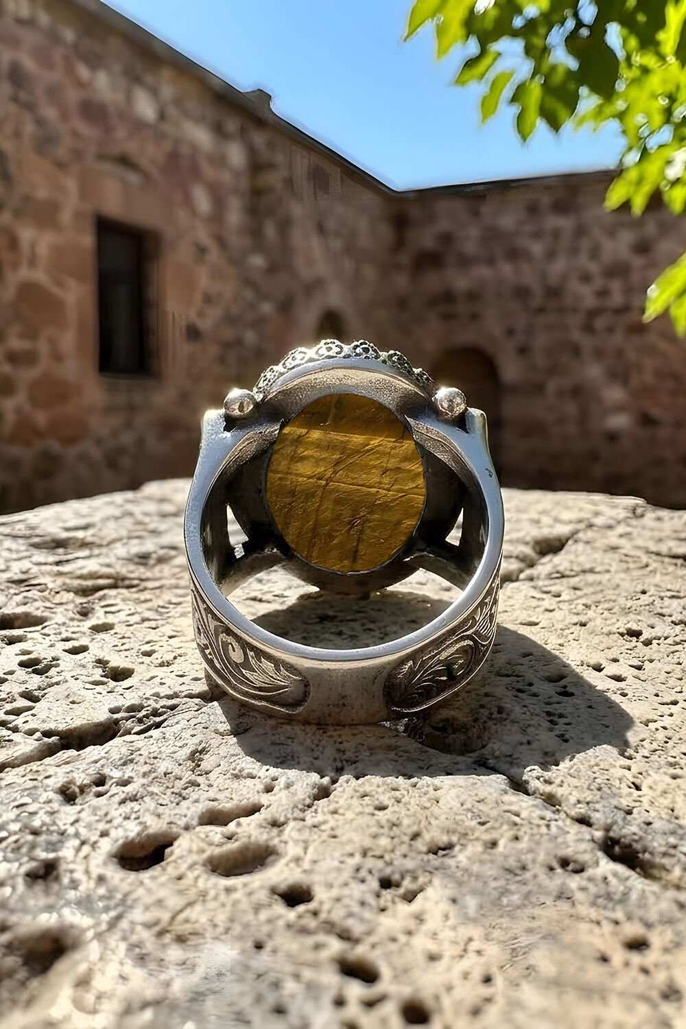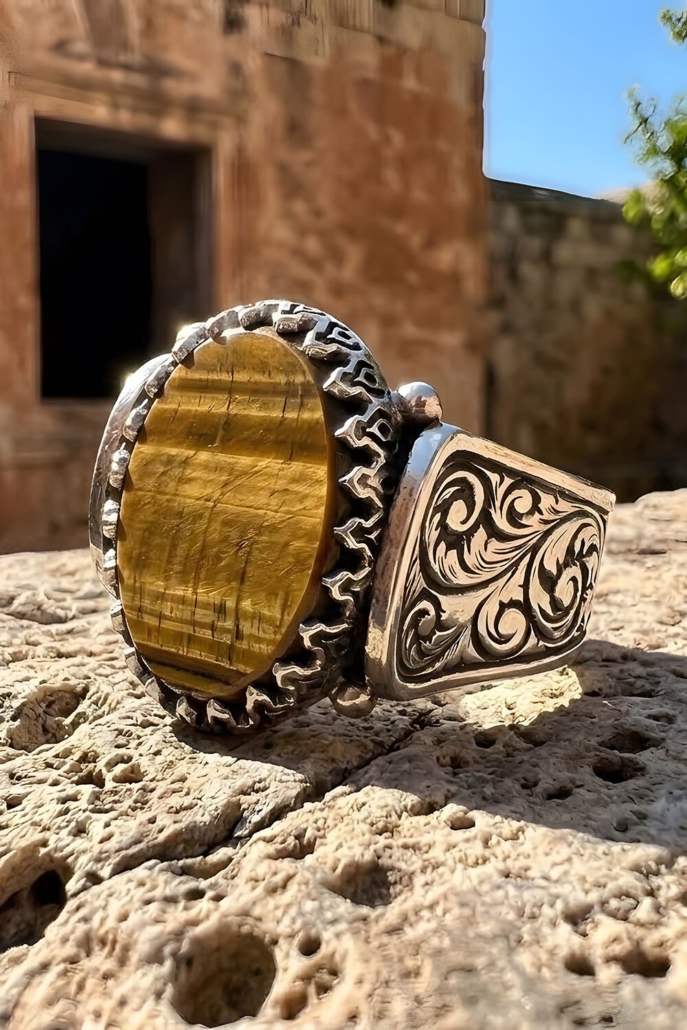 Kalem İşleme Desenli Kaplangözü Taşlı Gümüş Erkek Yüzük |