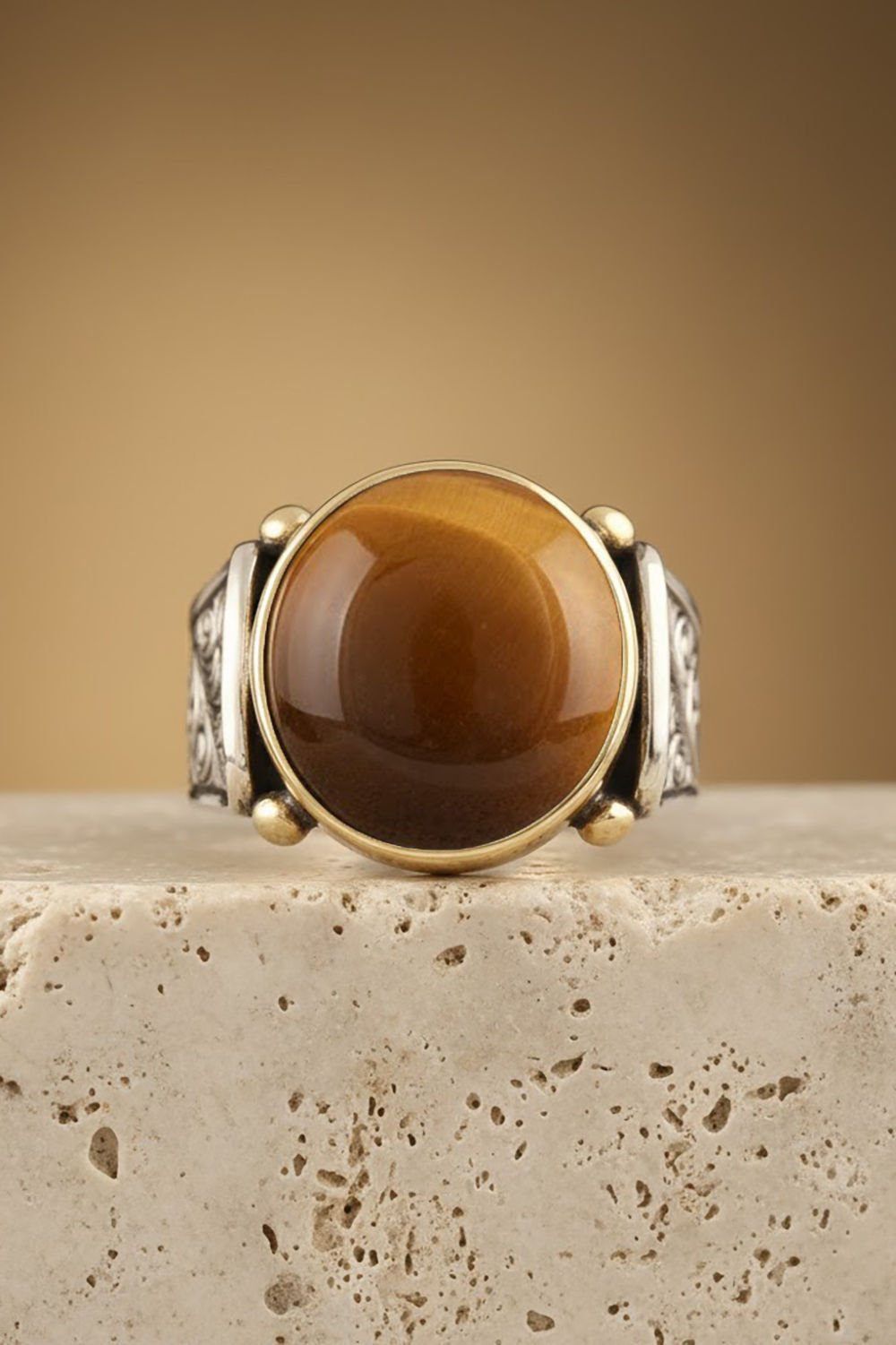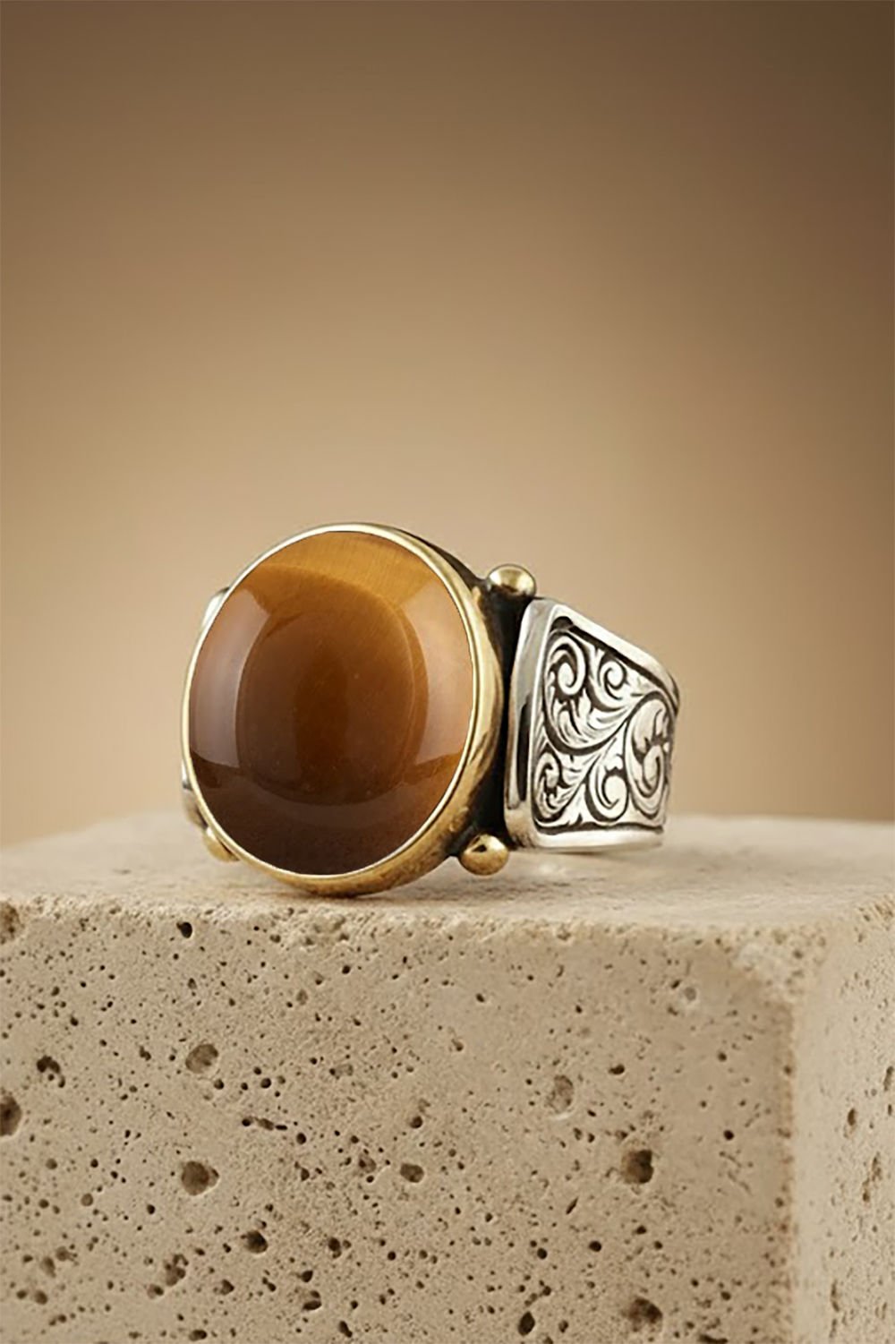 Hakiki ve orijinal doğal taşlar kullandığımız yüzüklerin bu modelinde Kaplangözü taşını kullanıyoruz.