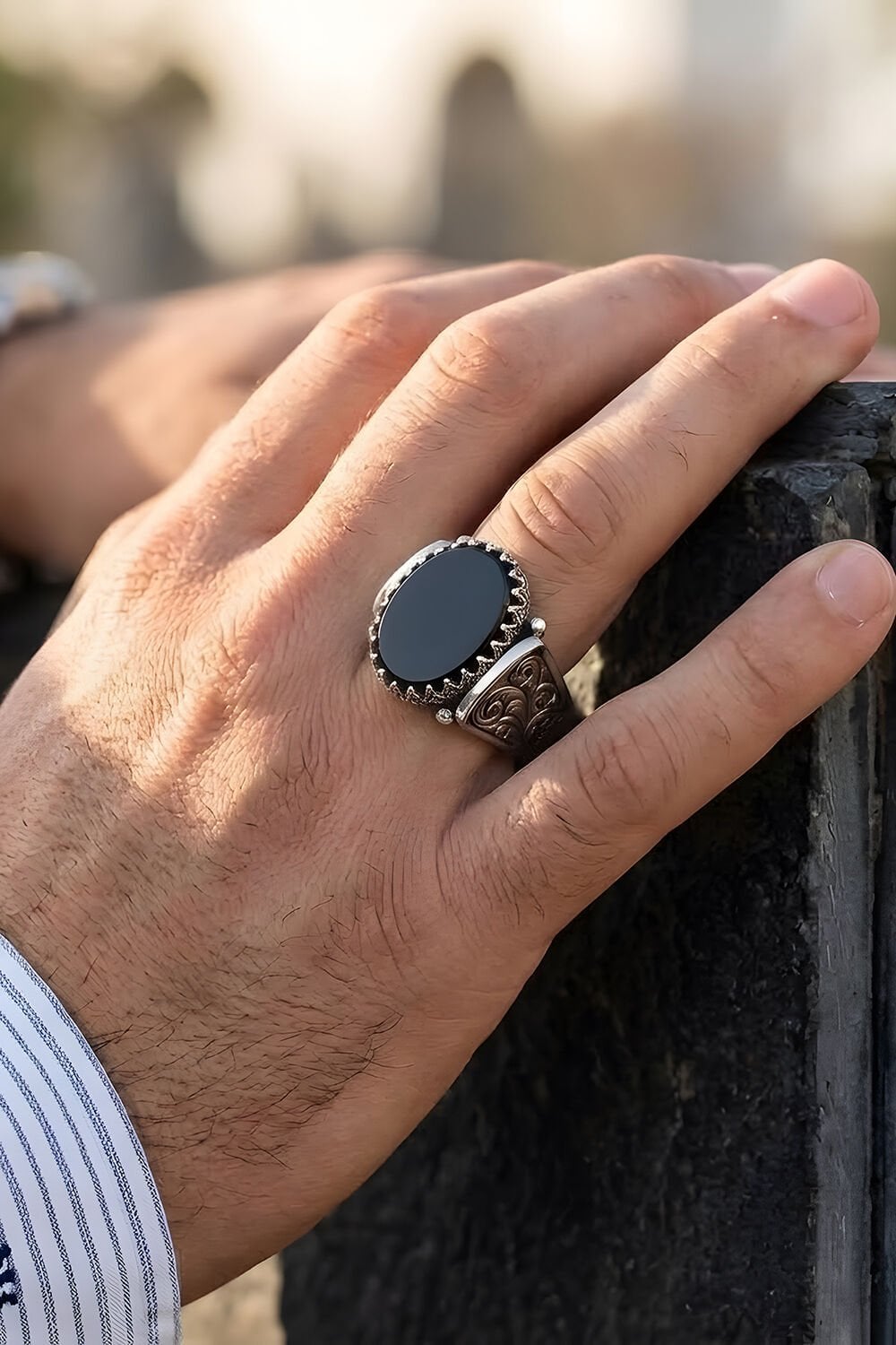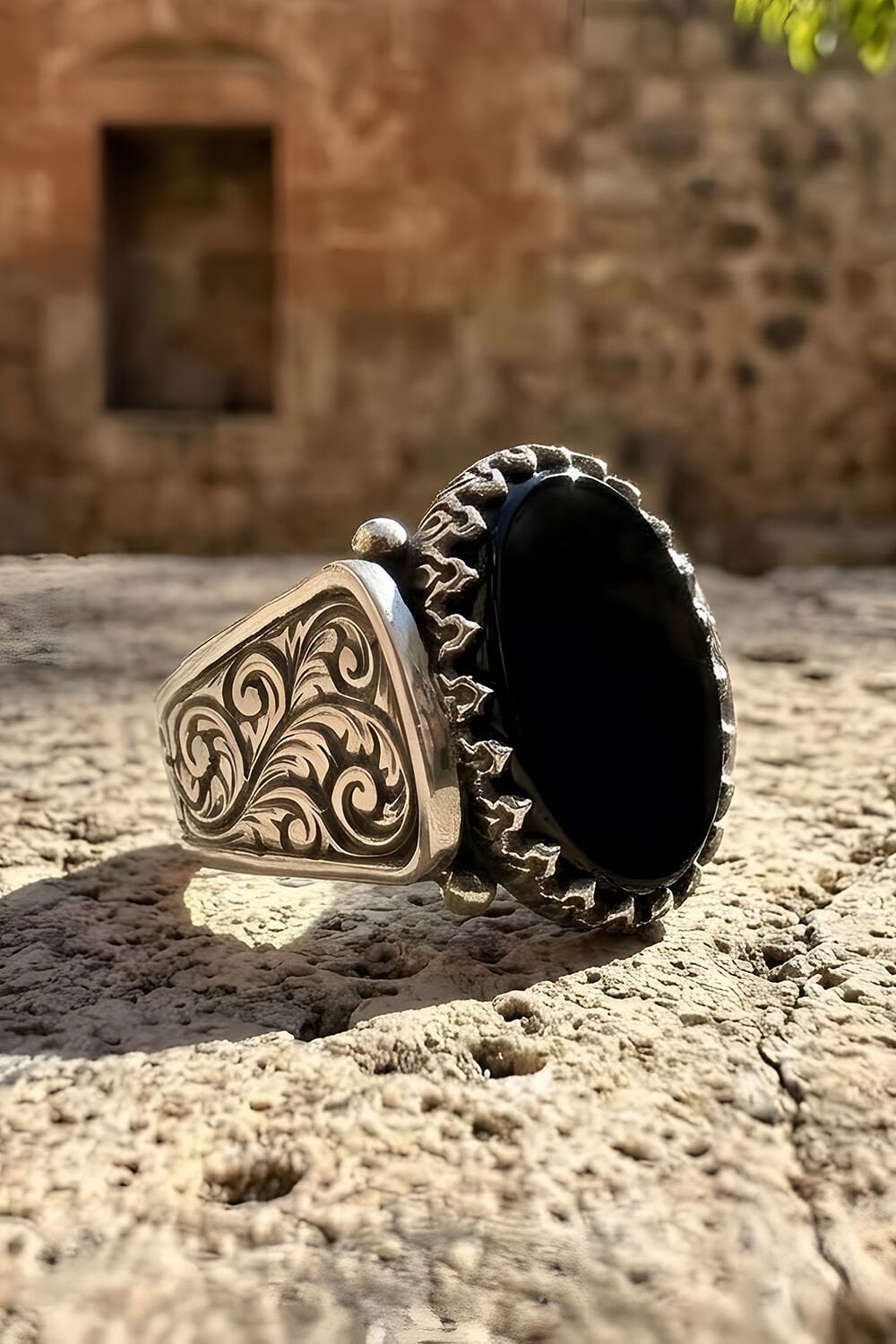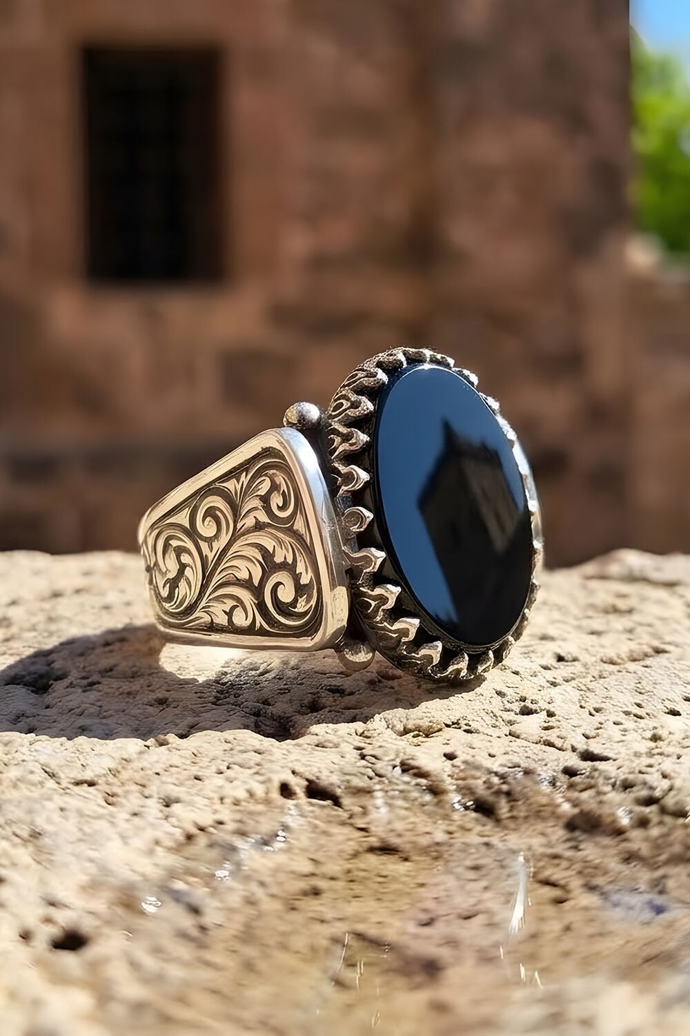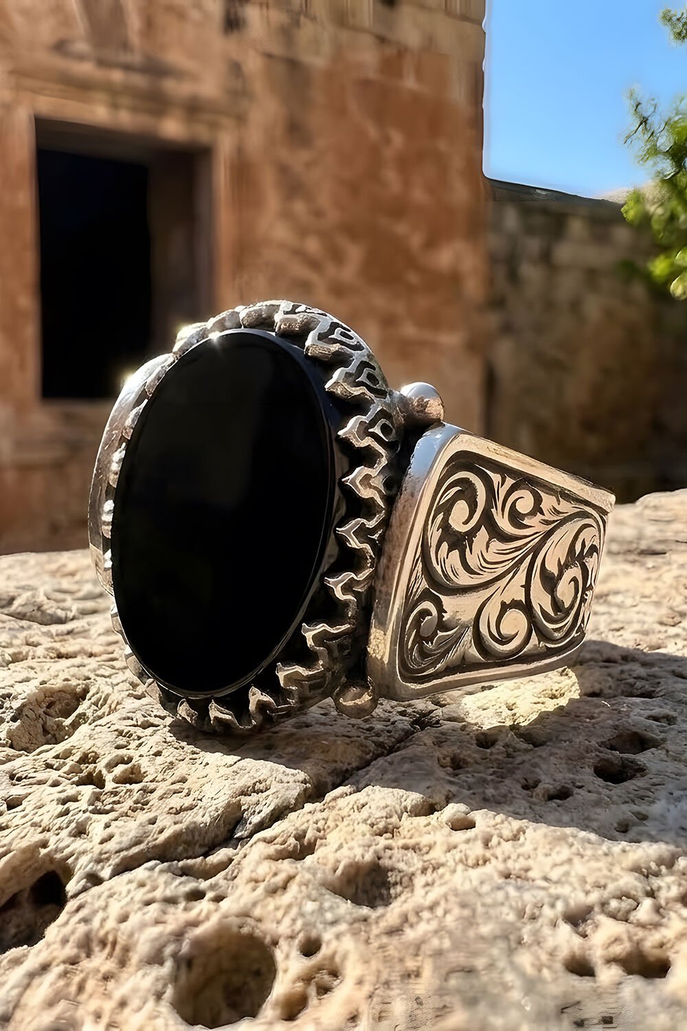 Kalem İşleme Desenli Oniks Taşlı Gümüş Erkek Yüzük |