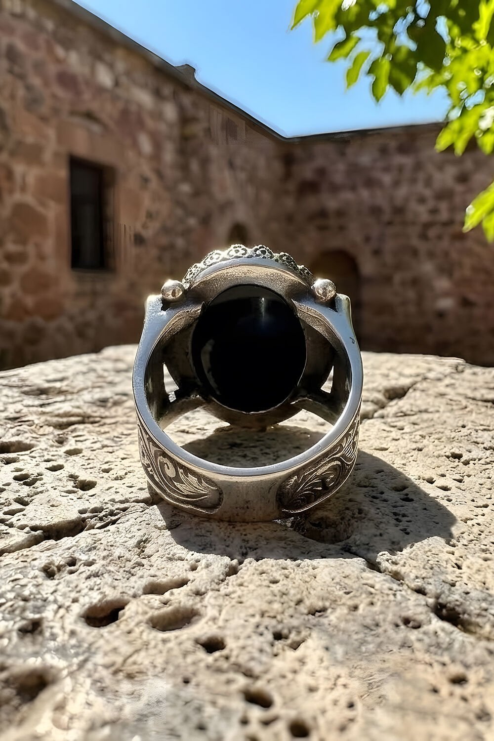 Kalem İşleme Desenli Oniks Taşlı Gümüş Erkek Yüzük