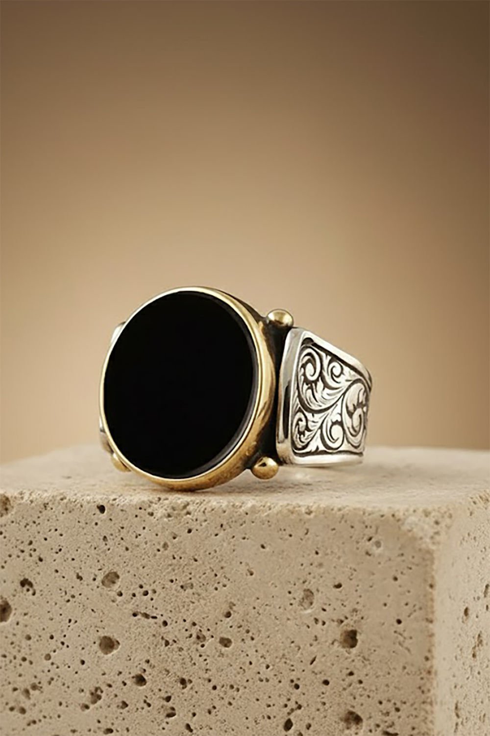Kalem İşleme Desenli Oniks Taşlı Gümüş Yüzük