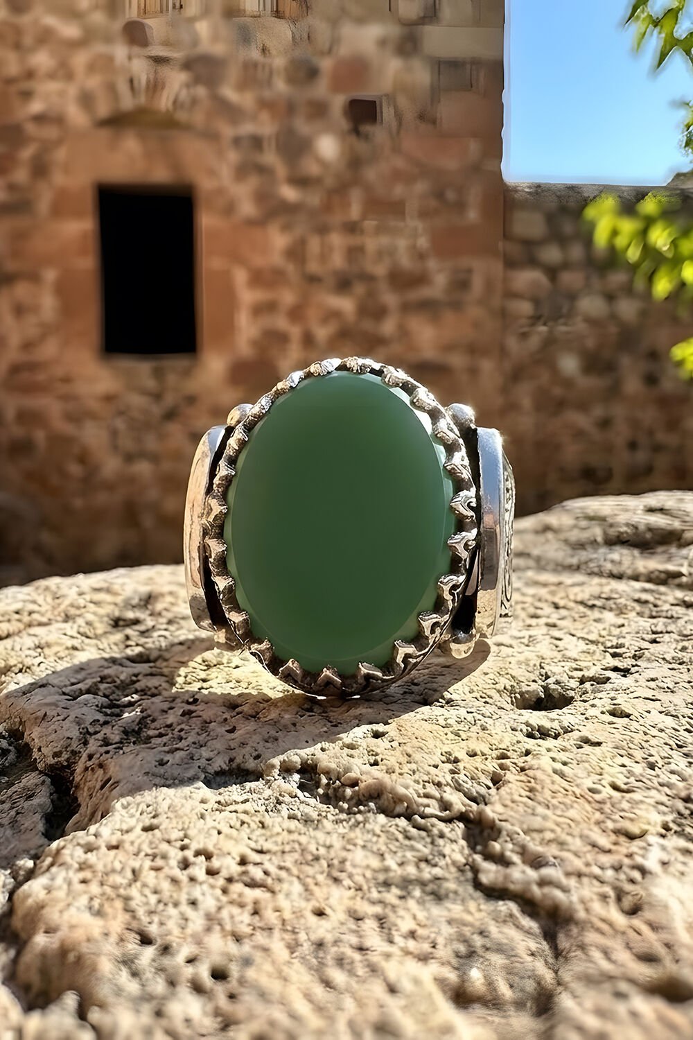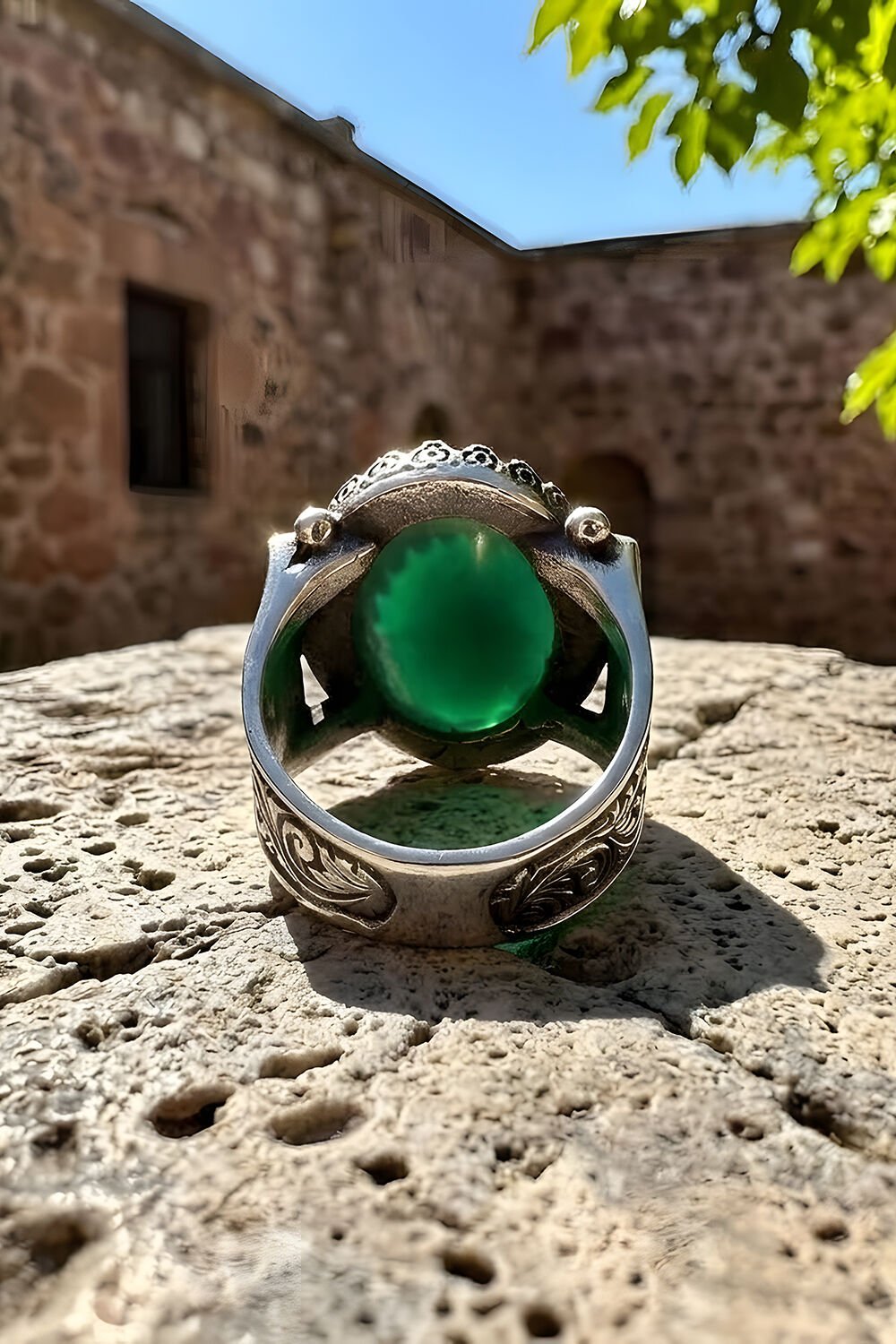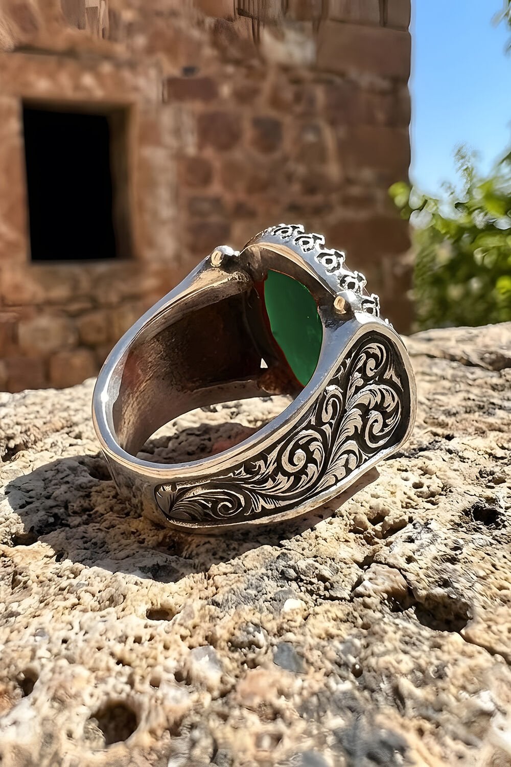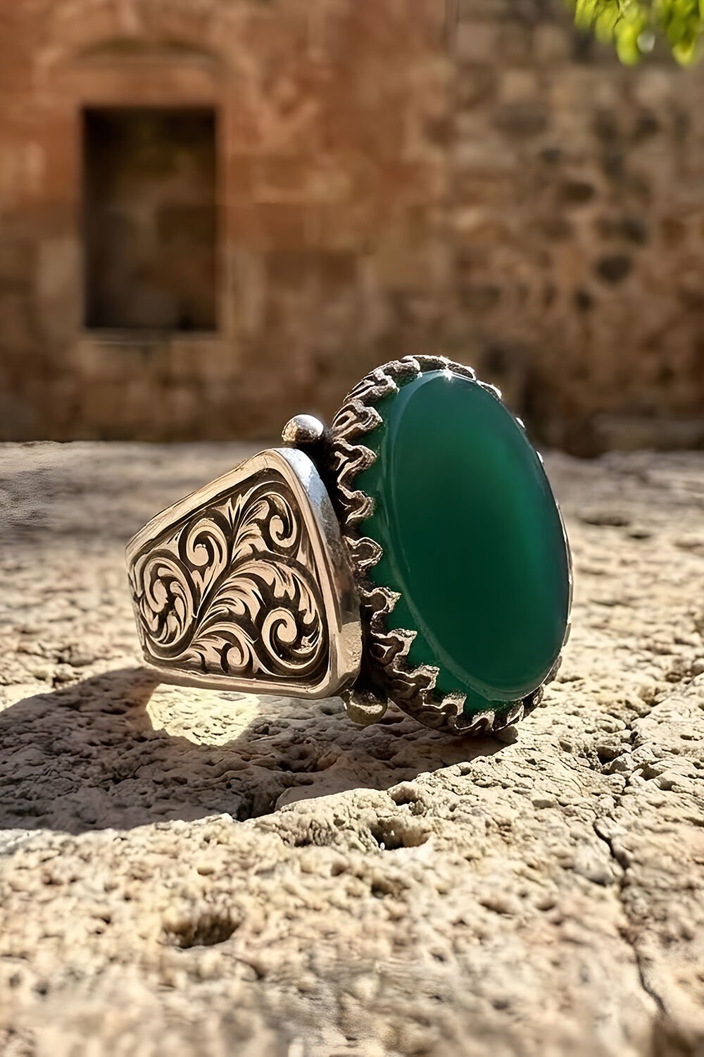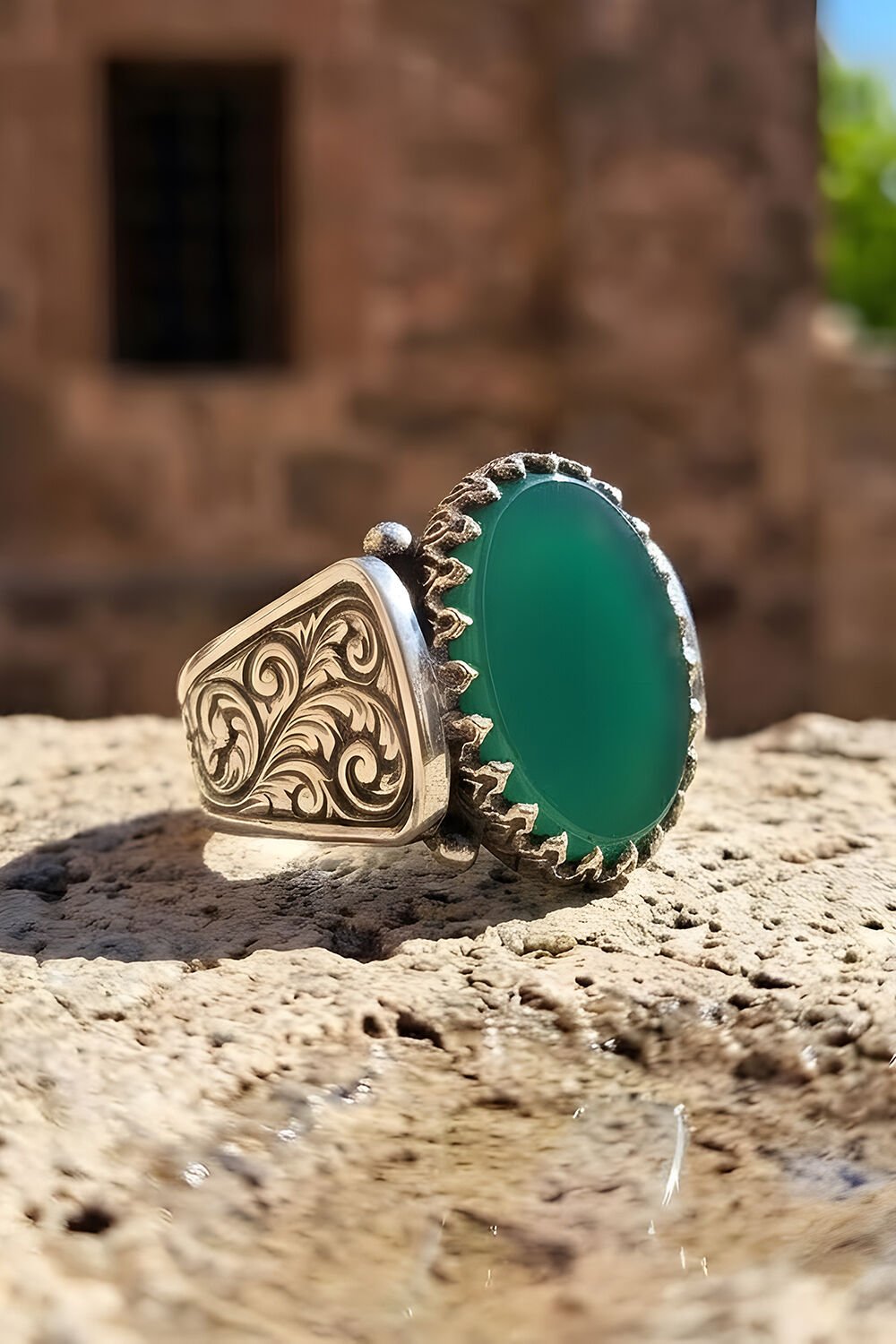 Kalem İşleme Desenli Yeşil Akik Taşlı Gümüş Erkek Yüzük |