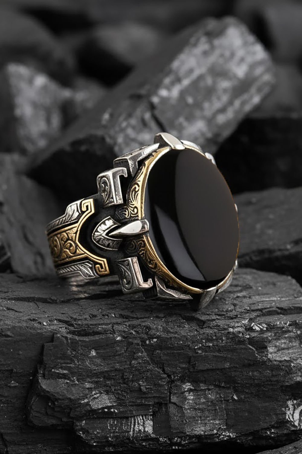 Kalem İşleme Oniks Taşlı Erkek Yüzüğü |