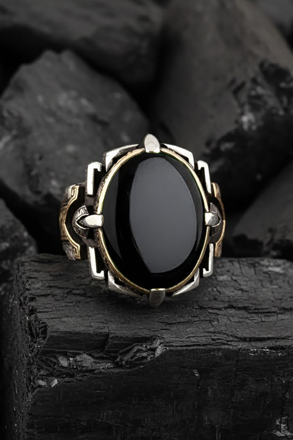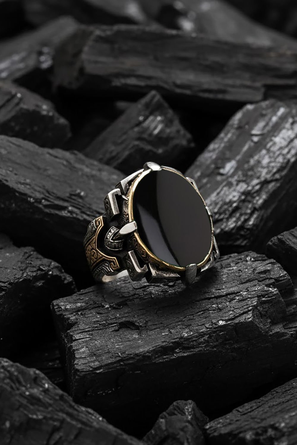 Yüzüğün merkezindeki doğal oniks taşı, muhteşem görünümü ve etkileyici enerjisiyle dikkat çeker. Karanlık tonları ve doğal desenleriyle her parçada eşsiz bir karakter sunar.