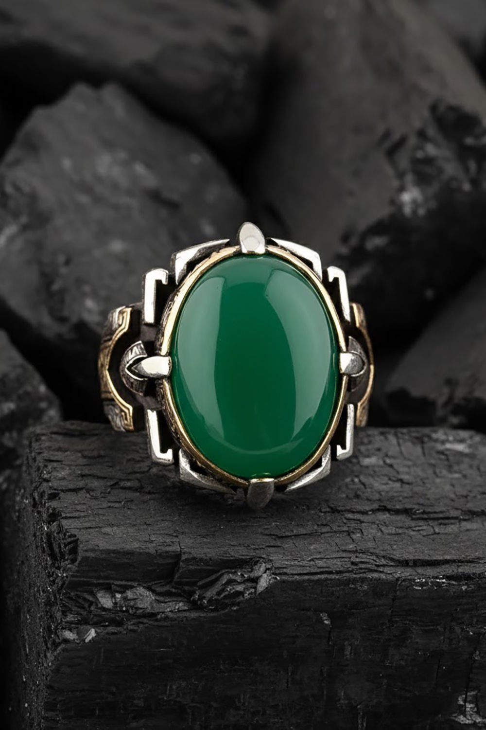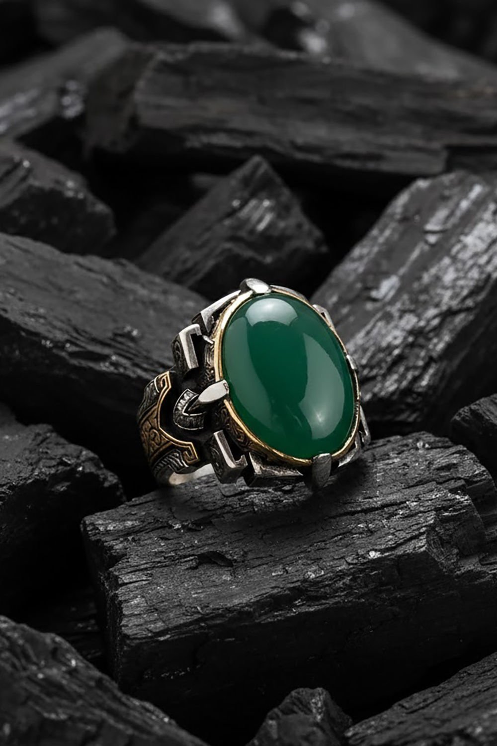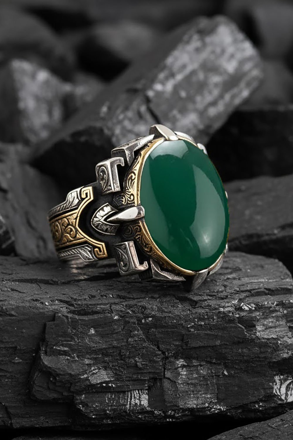 Kalem İşleme Yeşil Akik Taşlı Erkek Yüzüğü