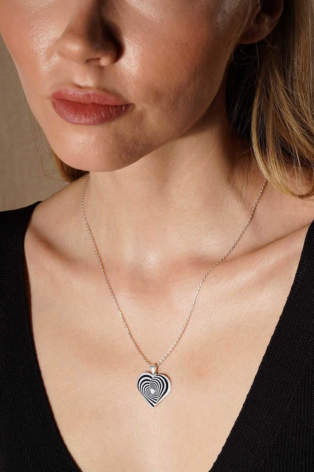Aşkın ve zarafetin sembolü olan desenli kalp siyah mineli gümüş kadın kolye, sevgilinize veya sevdiklerinize özel bir hediye seçeneği sunar. Üstün kaliteli gümüşten üretilmiş olan bu kolye, simetrik desenleri ve siyah mine detaylarıyla göz alıcı bir görünüm sunar.