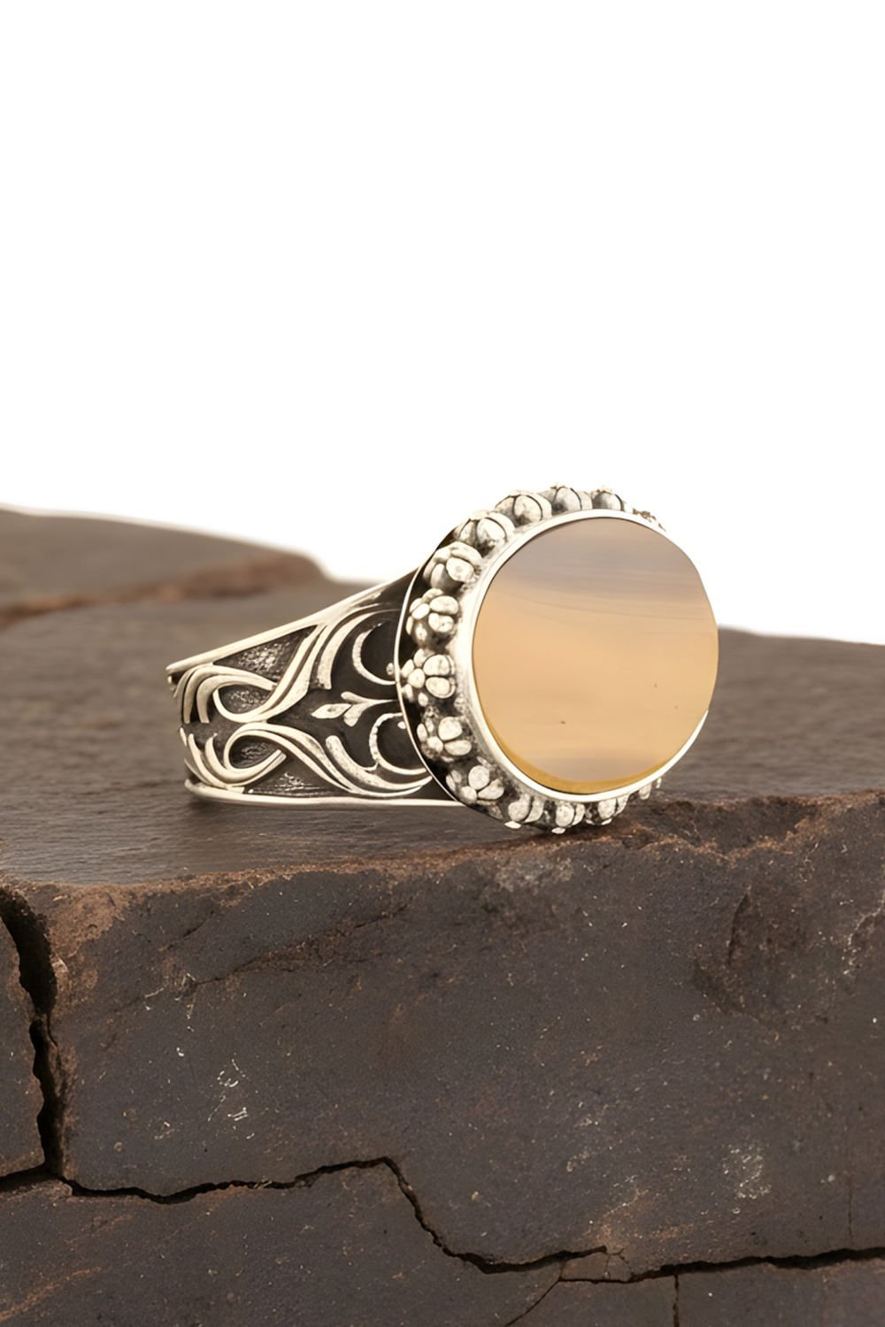 Bu özel tasarım gümüş erkek yüzük, natural kaplangözü taşıyla gücü ve zarafeti bir araya getiriyor. Usta el işçiliği ve özel detaylar ile tasarlanan bu yüzük, stilinize karakteristik bir dokunuş katıyor.