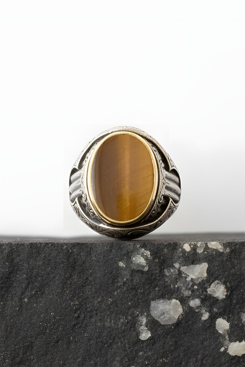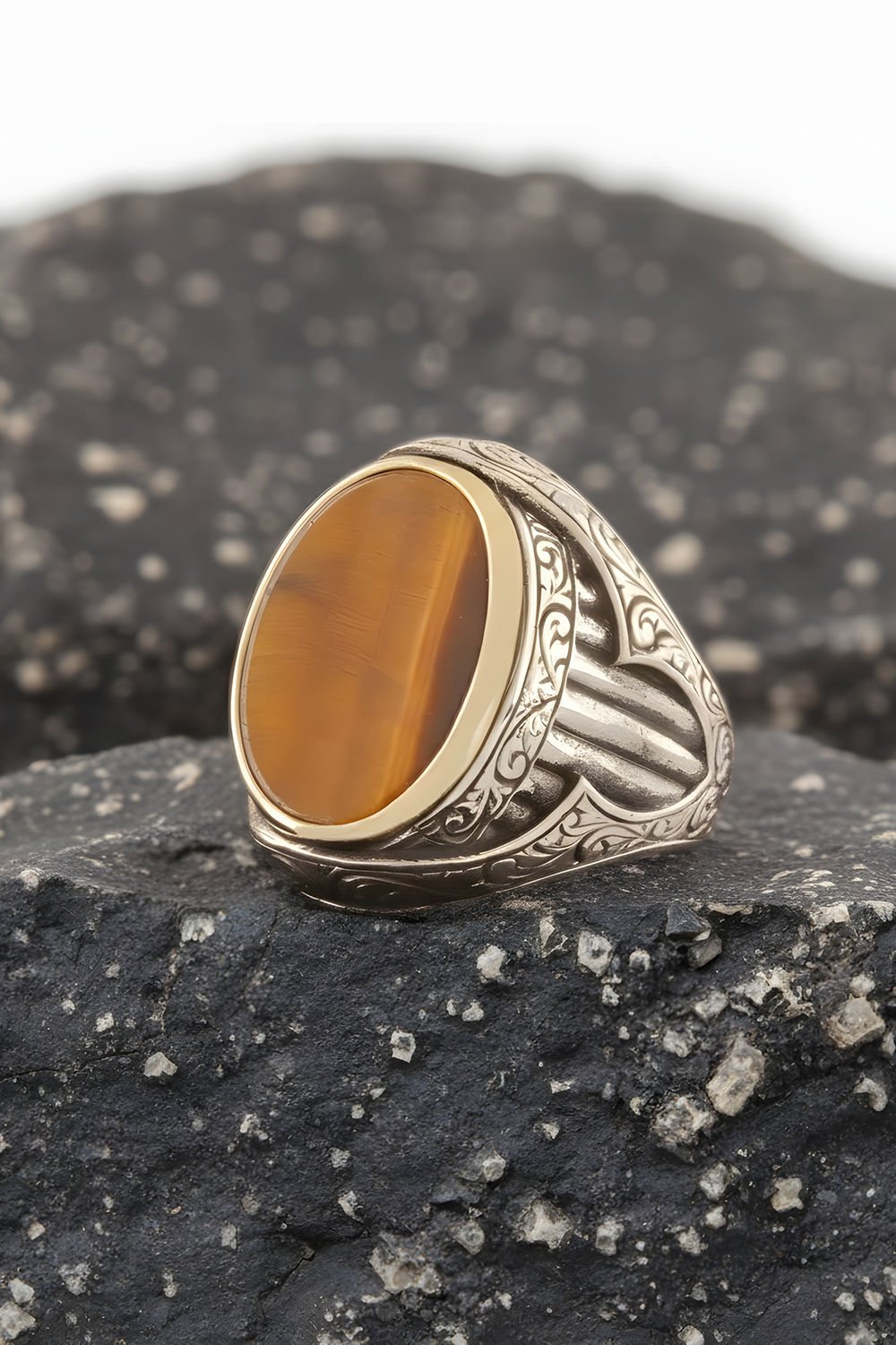 Hakiki ve orijinal doğal taşlar kullandığımız yüzüklerin bu modelinde Kaplangözü taşını kullanıyoruz.