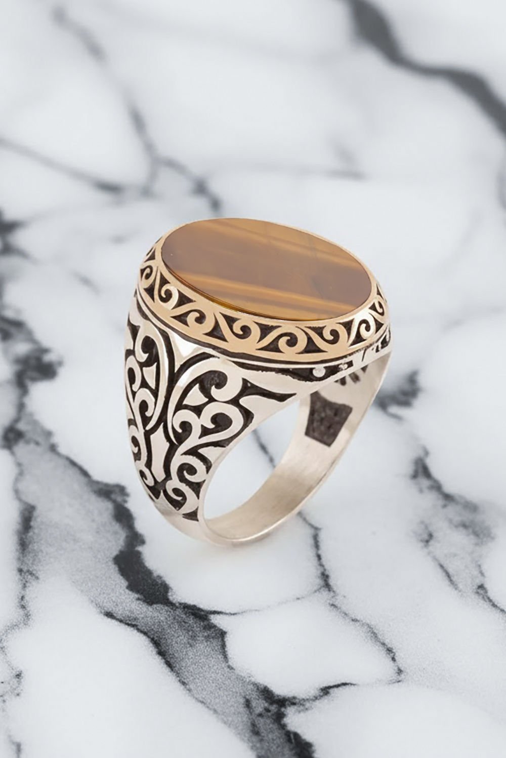 Hakiki ve orijinal doğal taşlar kullandığımız yüzüklerin bu modelinde Kaplangözü taşını kullanıyoruz.