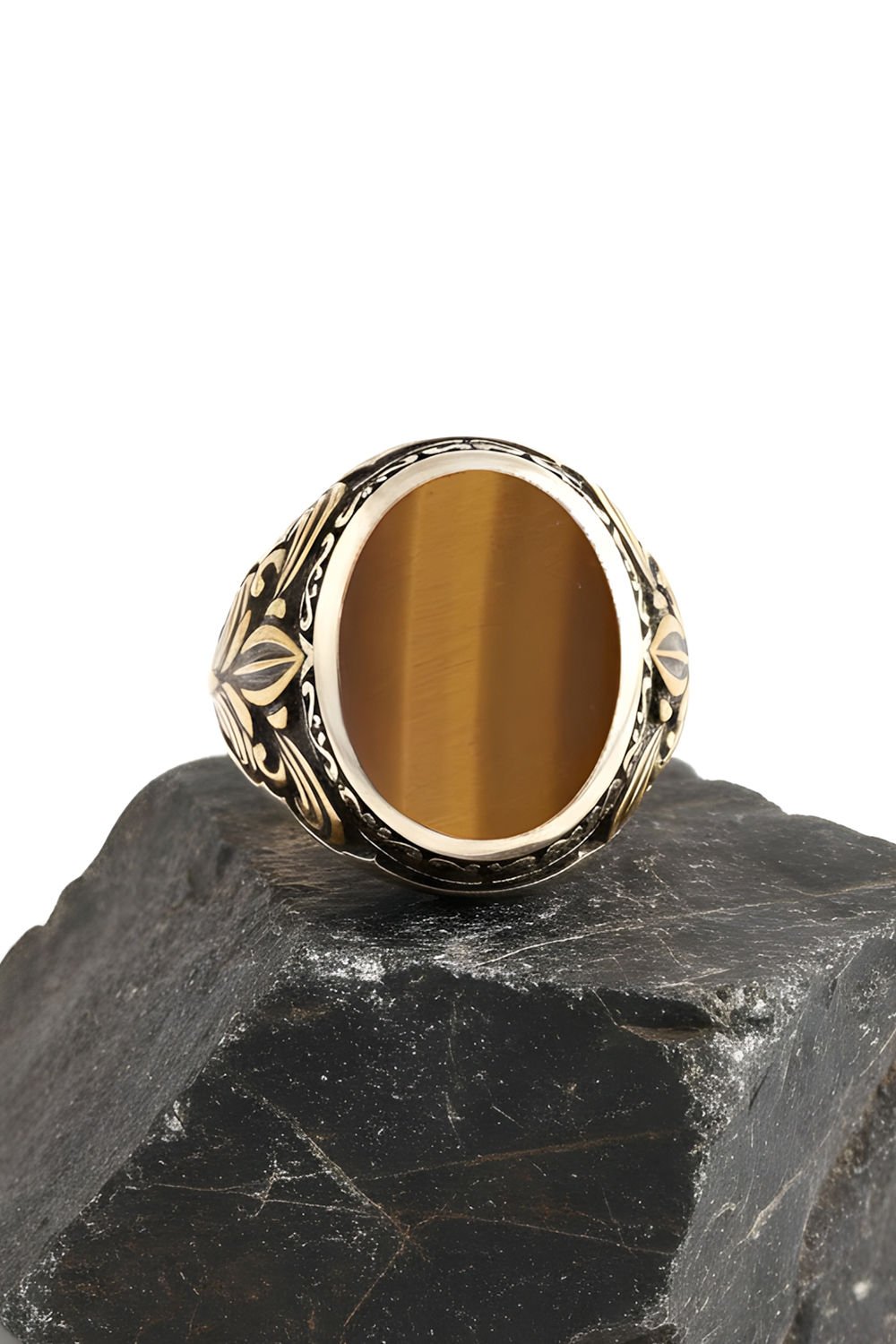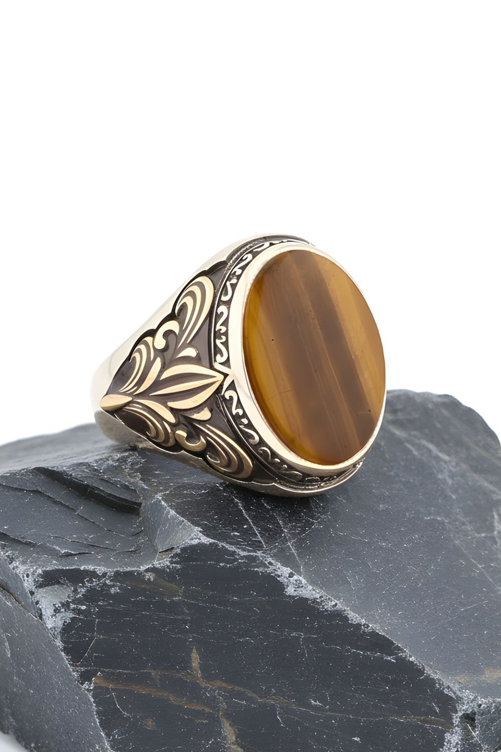 Hakiki ve orijinal doğal taşlar kullandığımız yüzüklerin bu modelinde Kaplangözü taşını kullanıyoruz.