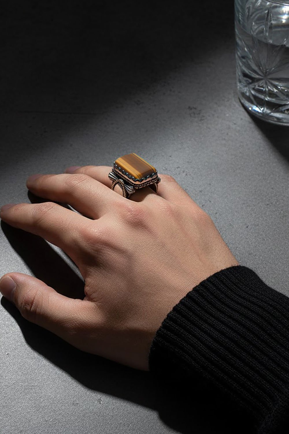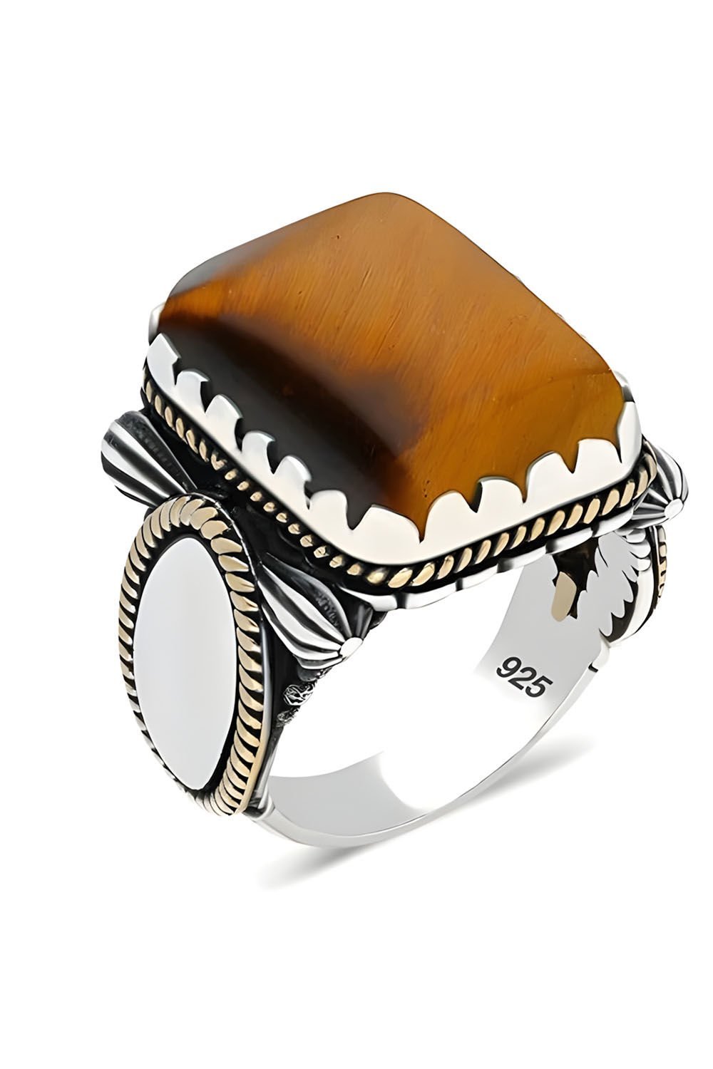 Bu özel erkek yüzüğü, doğal kaplangözü taşı ve el işçiliği ile 925 ayar gümüşten yapılmıştır. Her ayrıntısı ustalıkla işlenmiş olan bu yüzük, zarafet ve şıklığı bir araya getiriyor.