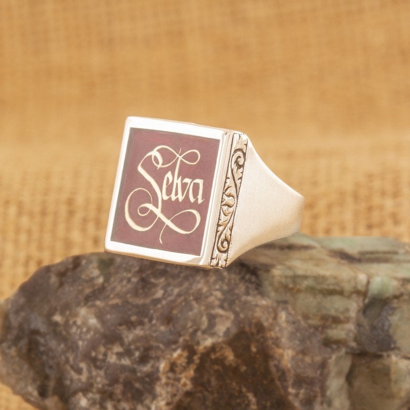 Kare Kasa Türkçe İsim İşlemeli Gümüş Yüzük |