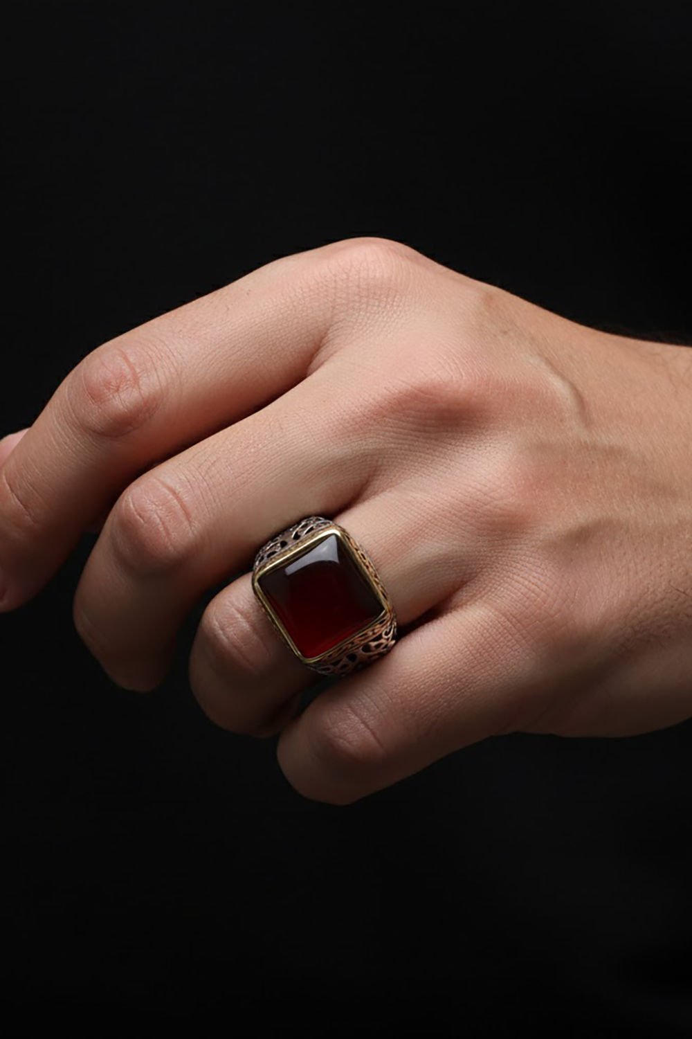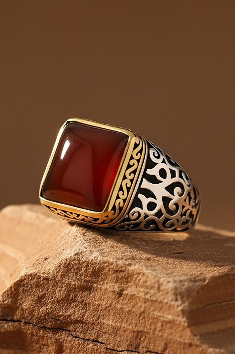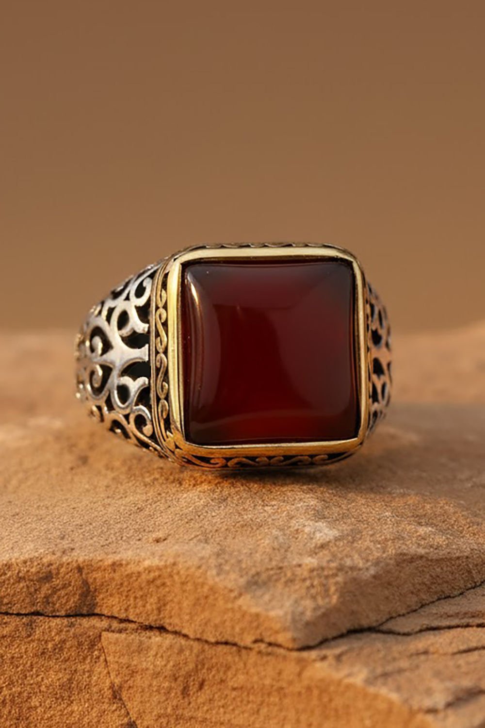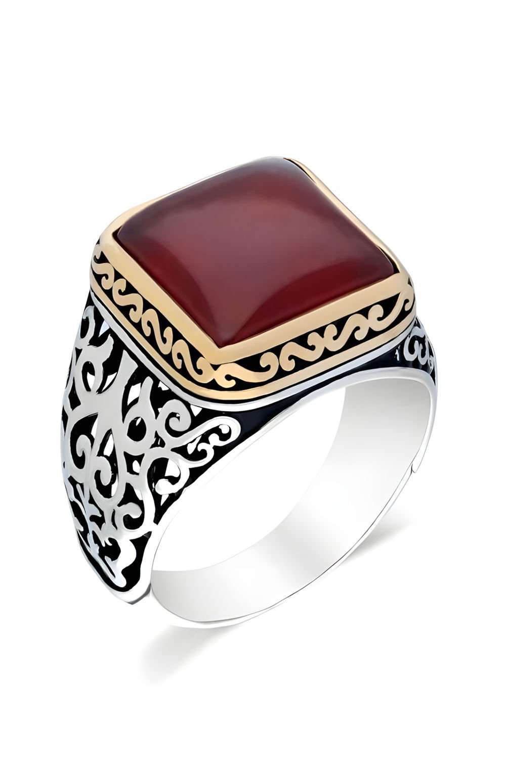Bu özel erkek yüzüğü, doğal akik taşı ve el işçiliği ile 925 ayar gümüşten yapılmıştır. Her ayrıntısı ustalıkla işlenmiş olan bu yüzük, kare modeliyle dikkat çekiyor.