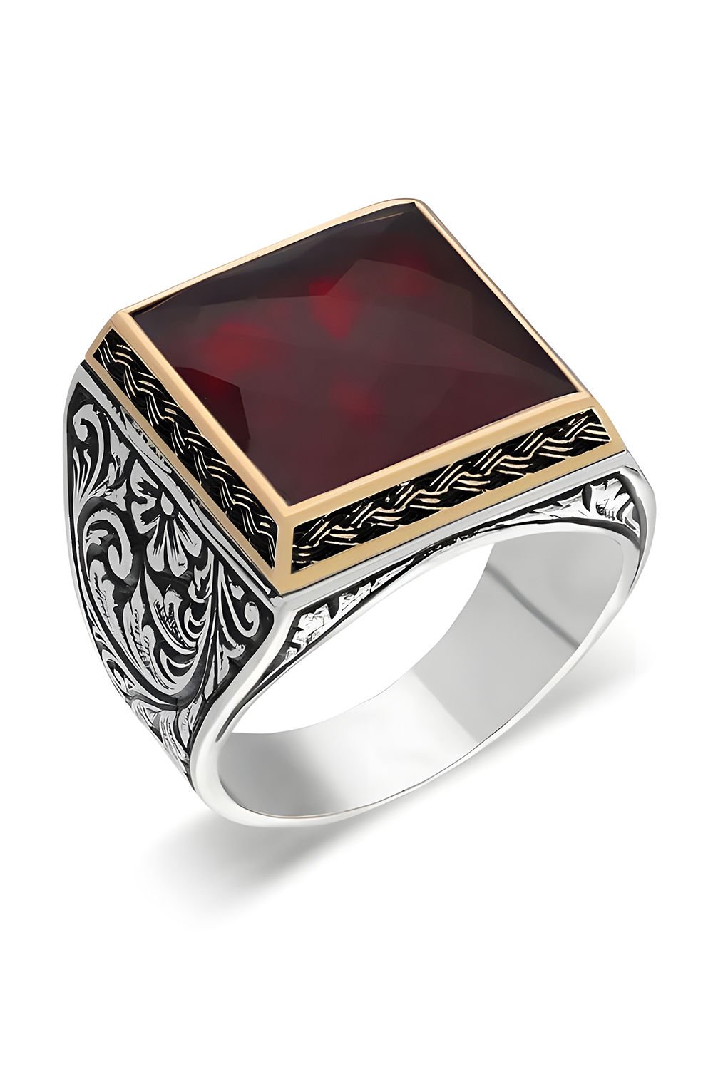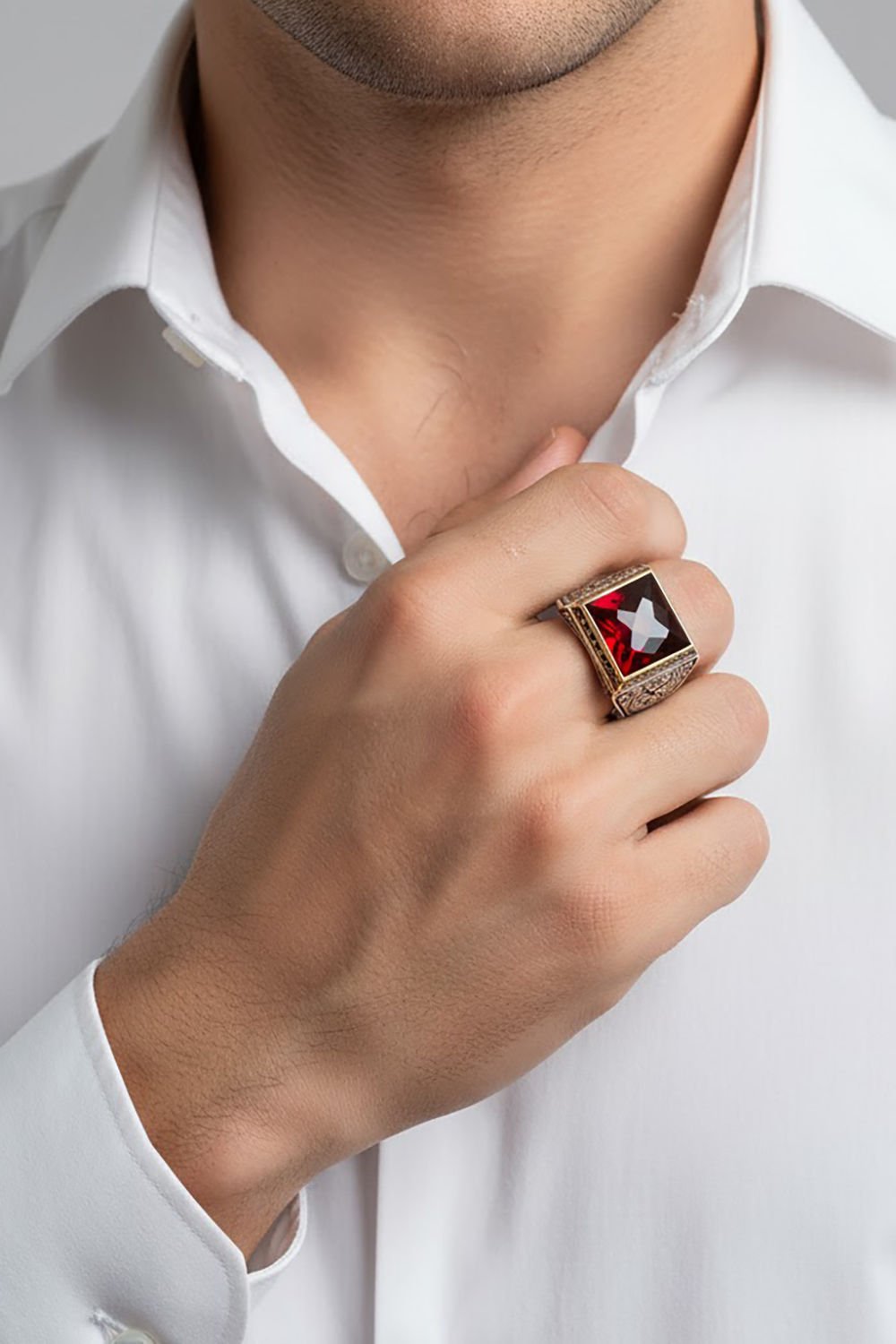 Kırmızı Taşlı Kare Model El İşçiliği Erkek Yüzük
