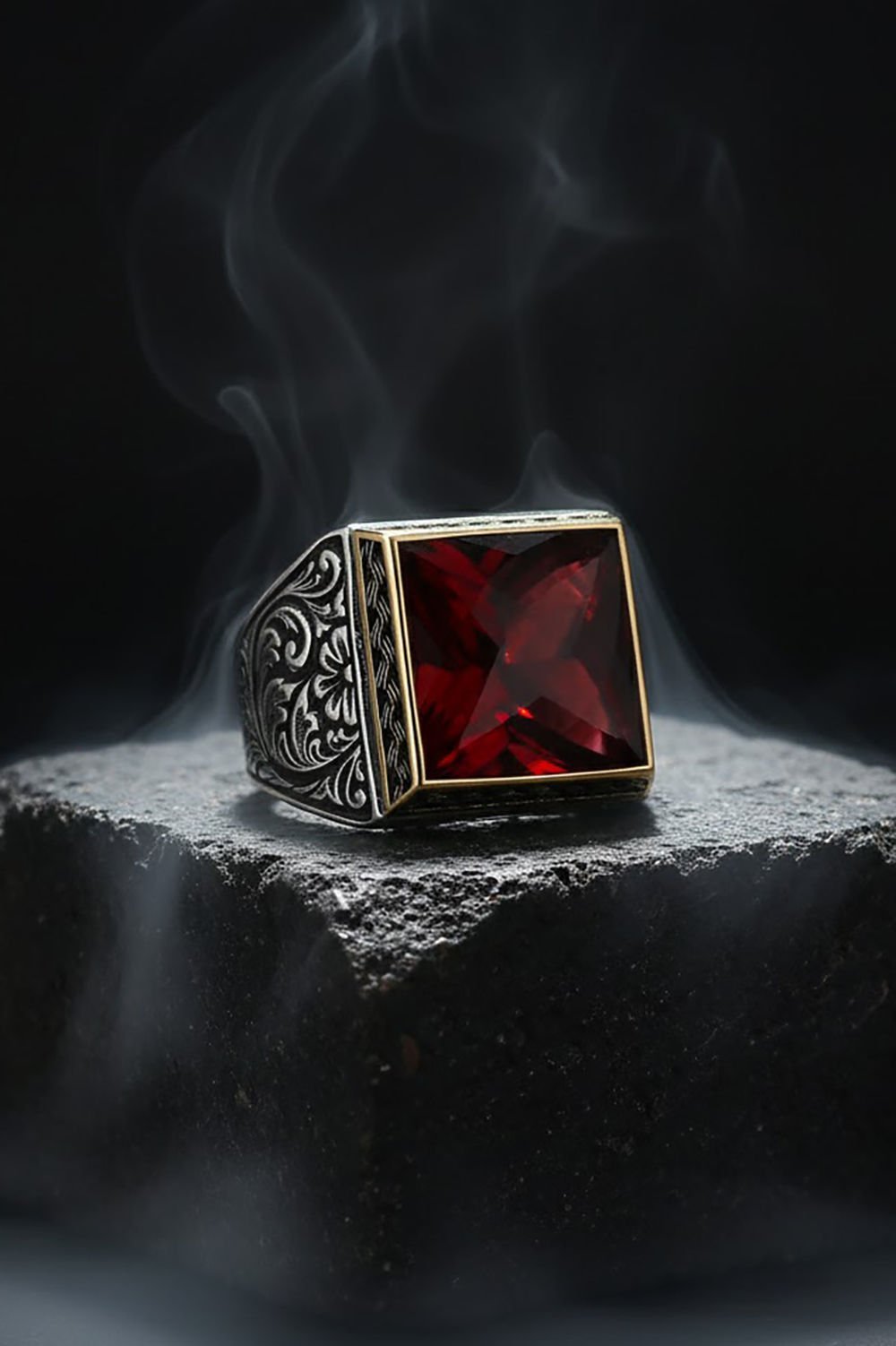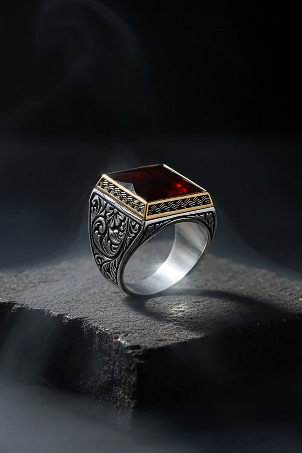 Bu özel erkek yüzüğü, göz alıcı kırmızı taşı ve 925 ayar gümüş ile özenle işlenmiştir. Kare modeli ve kalem işlemeli detaylarıyla benzersiz bir şıklık sunar.